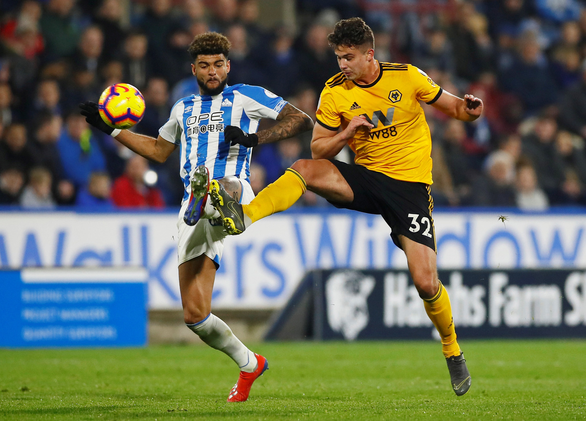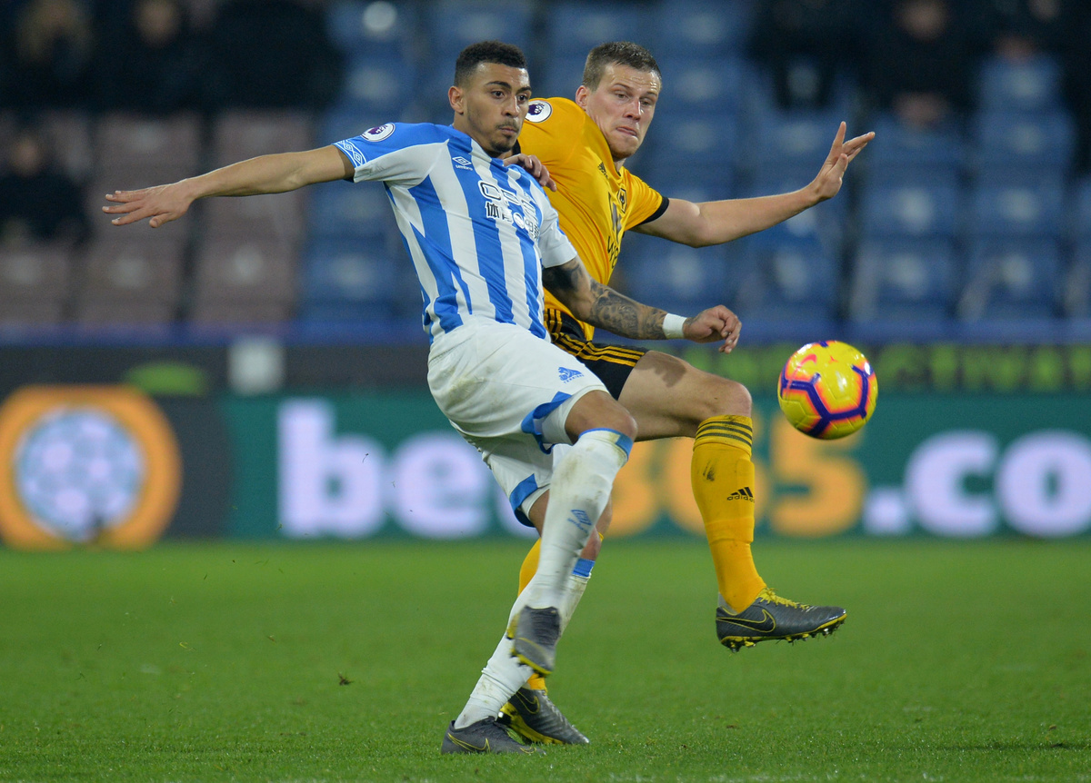 Soccer Football - Premier League - Huddersfield Town v Wolverhampton Wanderers - John Smith's Stadium, Huddersfield, Britain - February 26, 2019 Wolverhampton Wanderers' Leander Dendoncker in action with Huddersfield Town's Philip Billing Action Images via Reuters/Jason Cairnduff