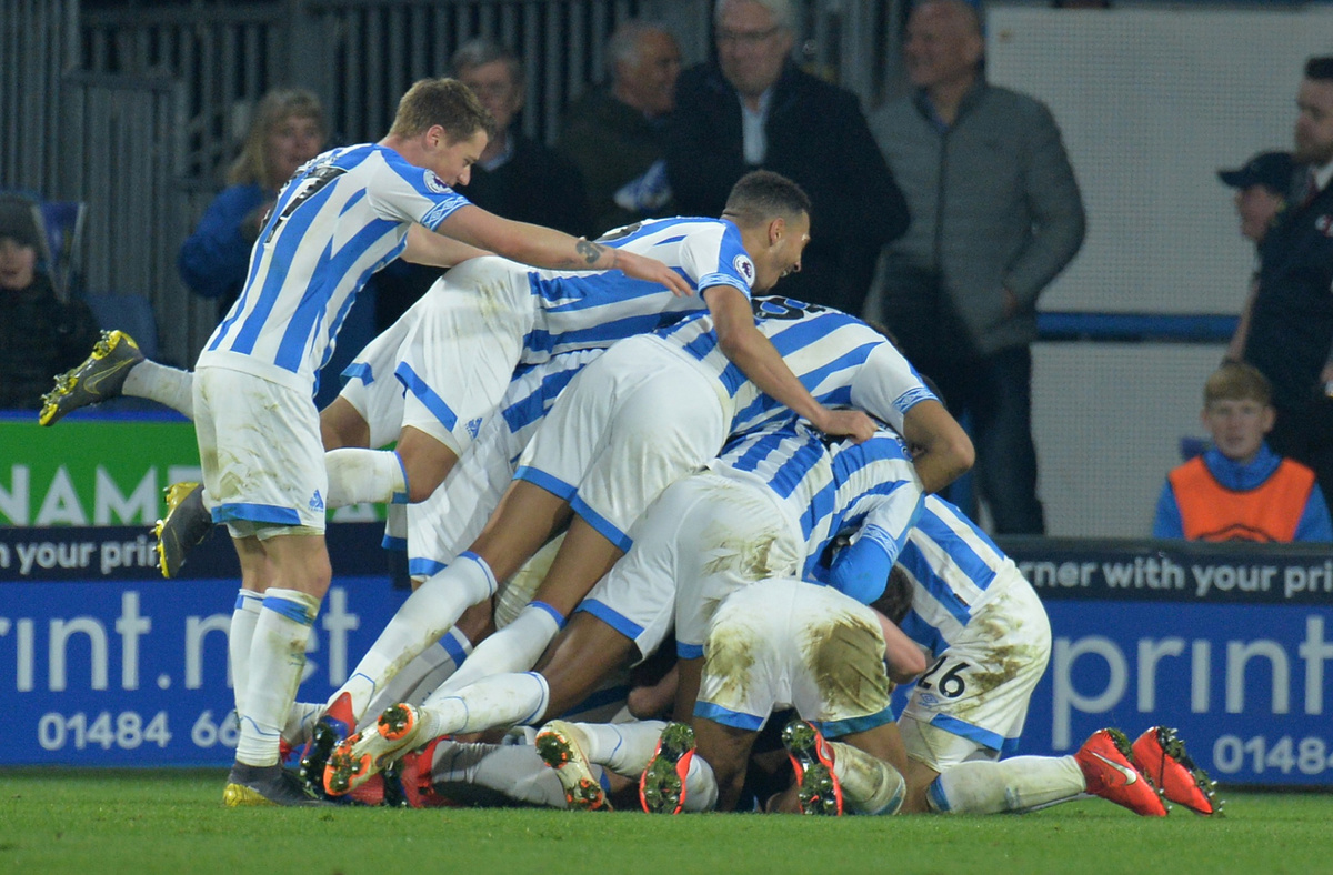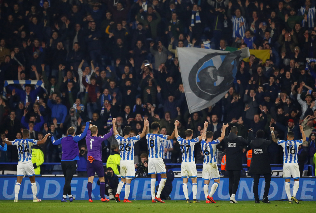 Soccer Football - Premier League - Huddersfield Town v Wolverhampton Wanderers - John Smith's Stadium, Huddersfield, Britain - February 26, 2019 Huddersfield Town players and fans celebrate after the match Action Images via Reuters/Jason Cairnduff