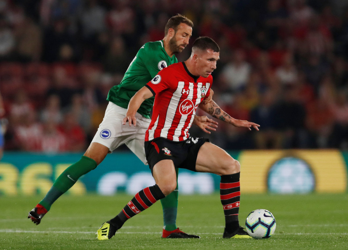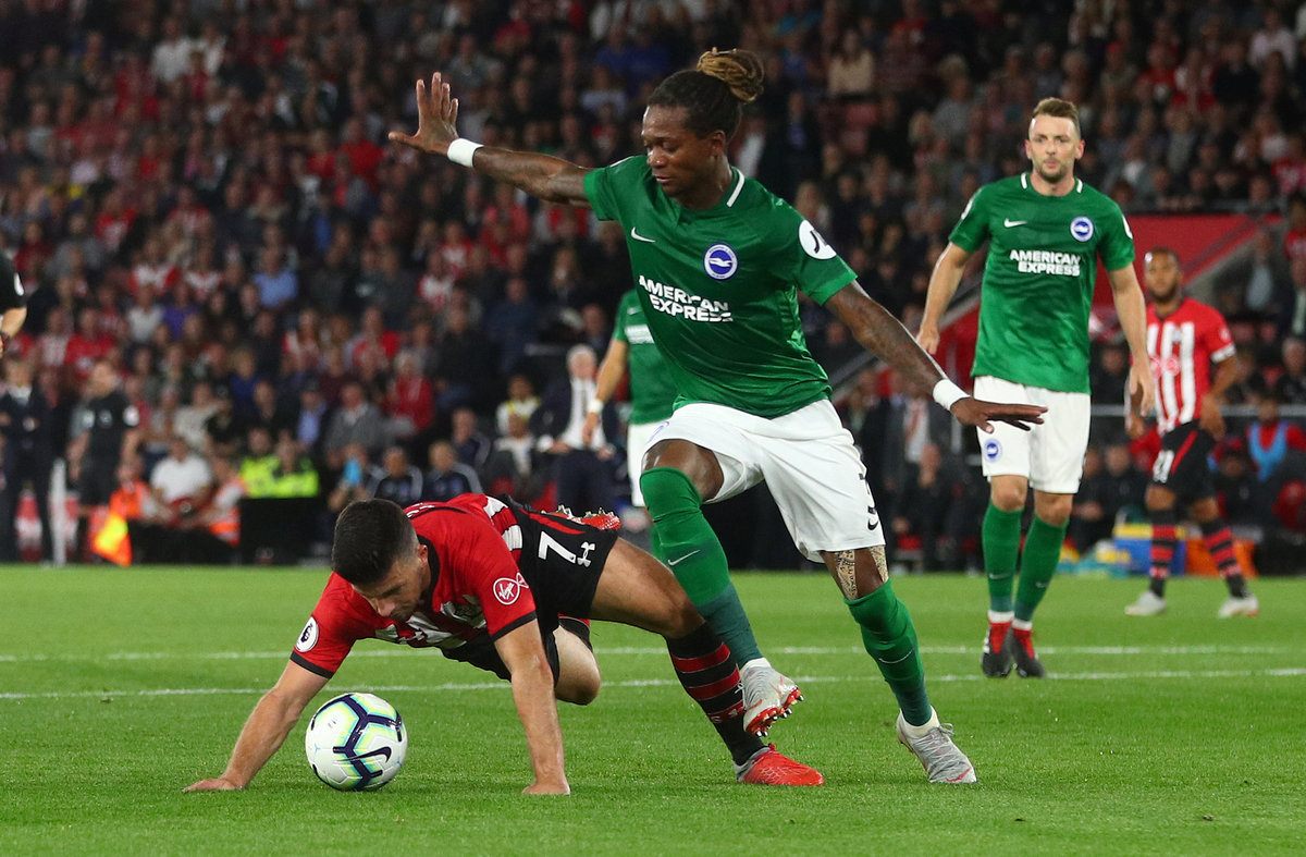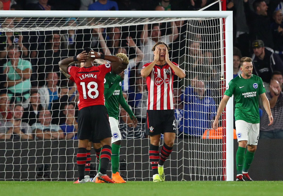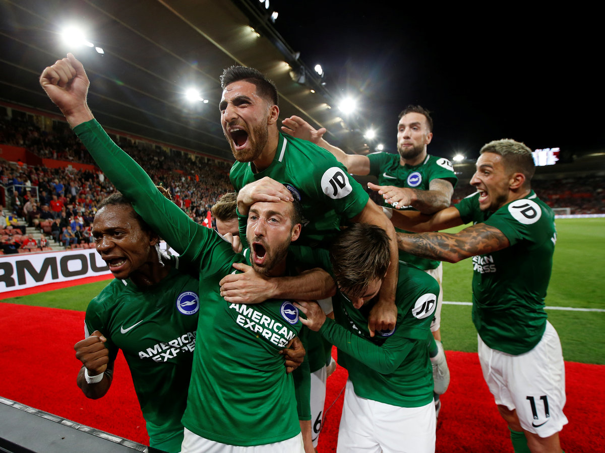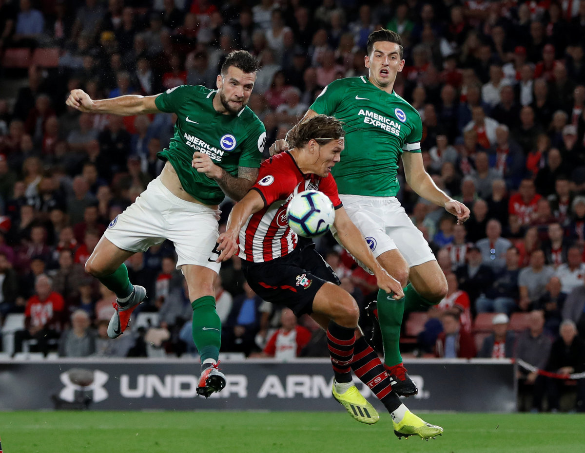 Soccer Football - Premier League - Southampton v Brighton & Hove Albion - St Mary's Stadium, Southampton, Britain - September 17, 2018 Brighton's Shane Duffy scores their first goal Action Images via Reuters/Paul ChildsSoccer Football - Premier League - Southampton v Brighton & Hove Albion - St Mary's Stadium, Southampton, Britain - September 17, 2018 Brighton's Shane Duffy celebrates scoring their first goal Action Images via Reuters/Paul Childs Soccer Football - Premier League - Southampton v Brighton & Hove Albion - St Mary's Stadium, Southampton, Britain - September 17, 2018 Southampton's Jannik Vestergaard in action with Brighton's Glenn Murray REUTERS/Hannah McKay Soccer Football - Premier League - Southampton v Brighton & Hove Albion - St Mary's Stadium, Southampton, Britain - September 17, 2018 Southampton's Shane Long goes down under the challenge of Brighton's Gaetan Bong REUTERS/Hannah McKay Soccer Football - Premier League - Southampton v Brighton & Hove Albion - St Mary's Stadium, Southampton, Britain - September 17, 2018 Brighton's Glenn Murray scores their second goal from the penalty spot REUTERS/Hannah McKaySoccer Football - Premier League - Southampton v Brighton & Hove Albion - St Mary's Stadium, Southampton, Britain - September 17, 2018 Brighton's Anthony Knockaert celebrates after Glenn Murray (R) scores their second goal Action Images via Reuters/Paul Childs