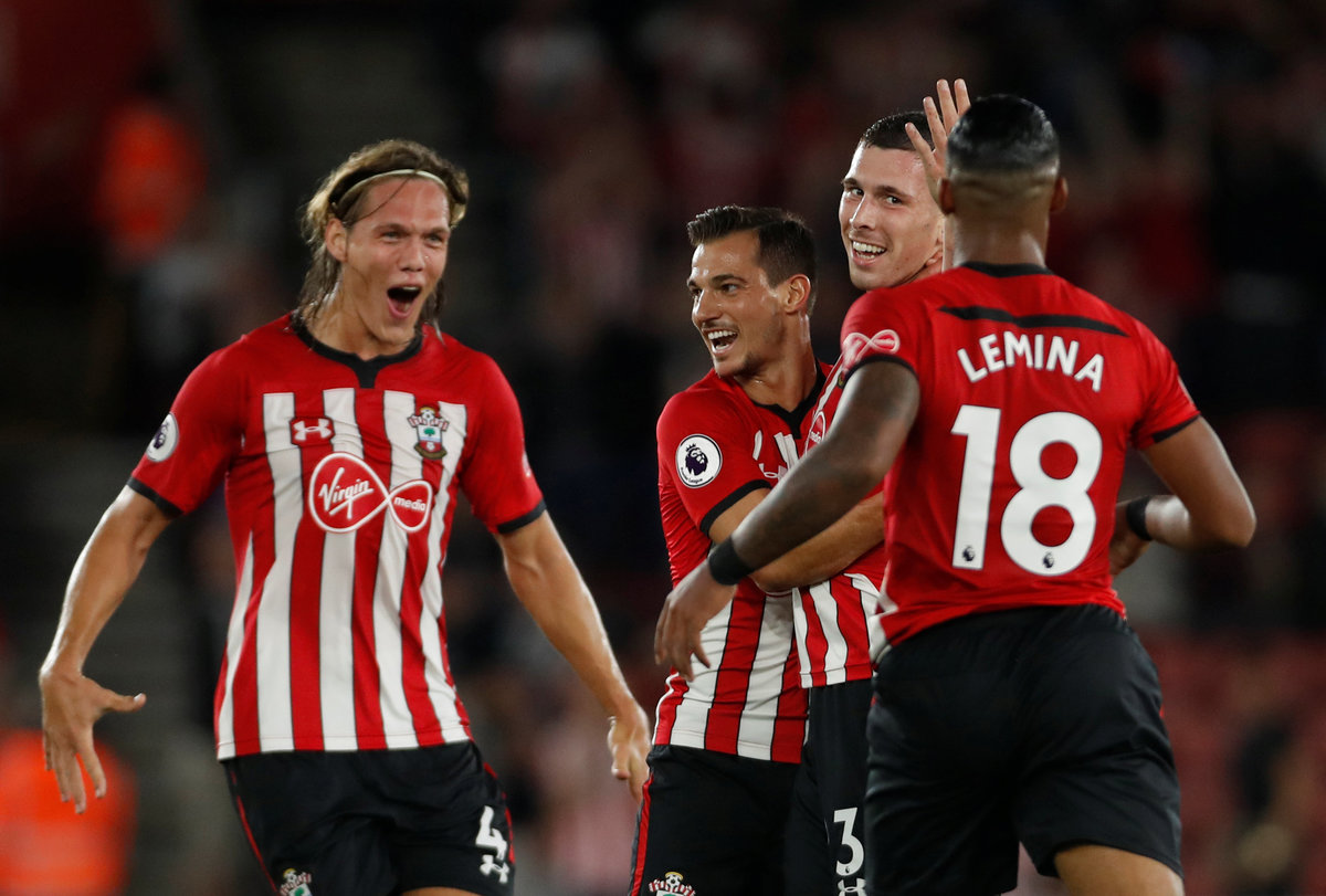 Soccer Football - Premier League - Southampton v Brighton & Hove Albion - St Mary's Stadium, Southampton, Britain - September 17, 2018 Southampton's Pierre-Emile Hojbjerg celebrates scoring their first goal with Jannik Vestergaard, Cedric Soares and Mario Lemina Action Images via Reuters/Paul Childs