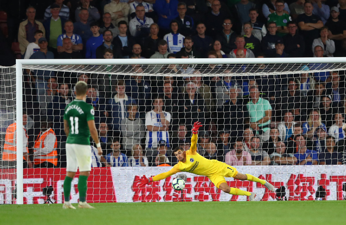 Soccer Football - Premier League - Southampton v Brighton & Hove Albion - St Mary's Stadium, Southampton, Britain - September 17, 2018 Brighton's Mathew Ryan dives as Southampton's Pierre-Emile Hojbjerg scores their first goal REUTERS/Hannah McKay