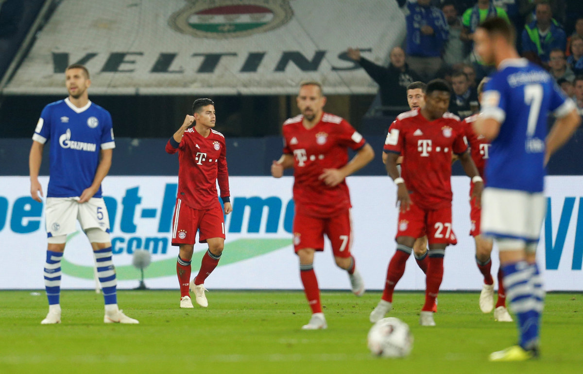 Soccer Football - Bundesliga - Schalke 04 v Bayern Munich - Veltins-Arena, Gelsenkirchen, Germany - September 22, 2018 Bayern Munich's James Rodriguez celebrates scoring their first goal with team mates REUTERS/Leon Kuegeler DFL regulations prohibit any use of photographs as image sequences and/or quasi-video