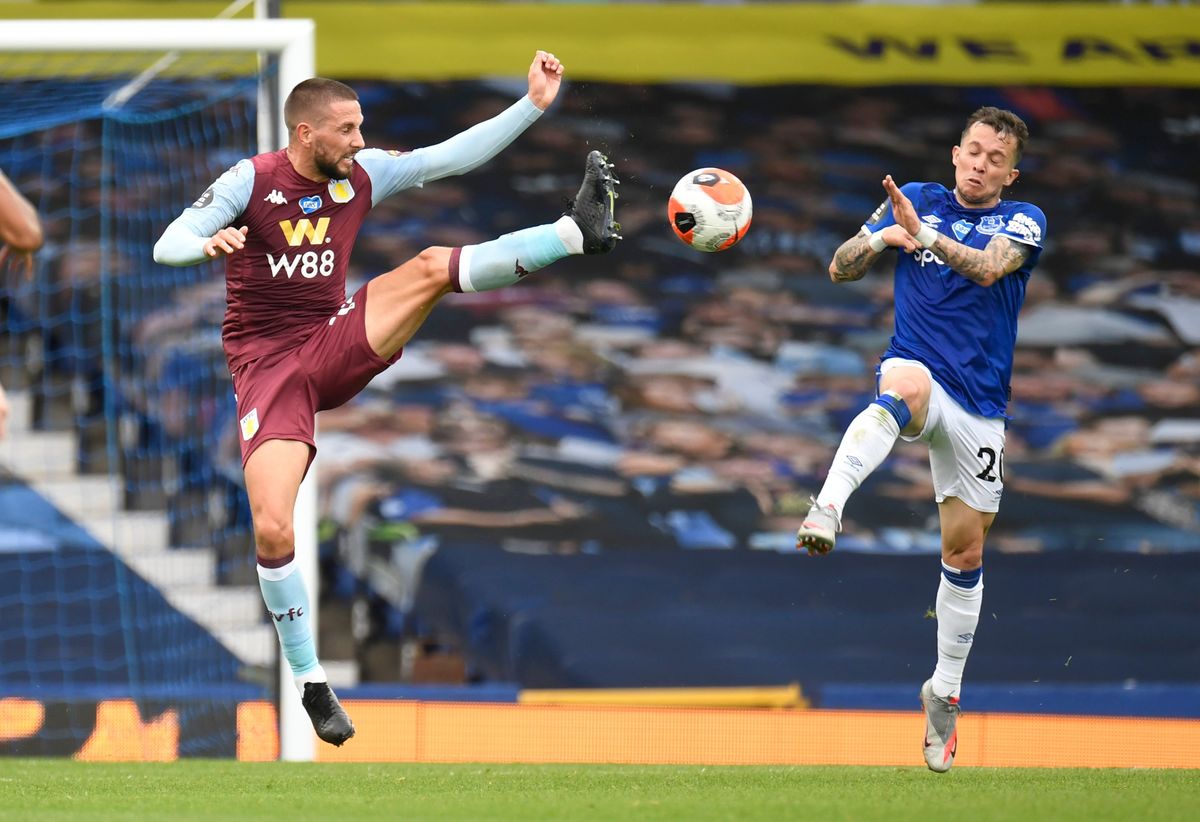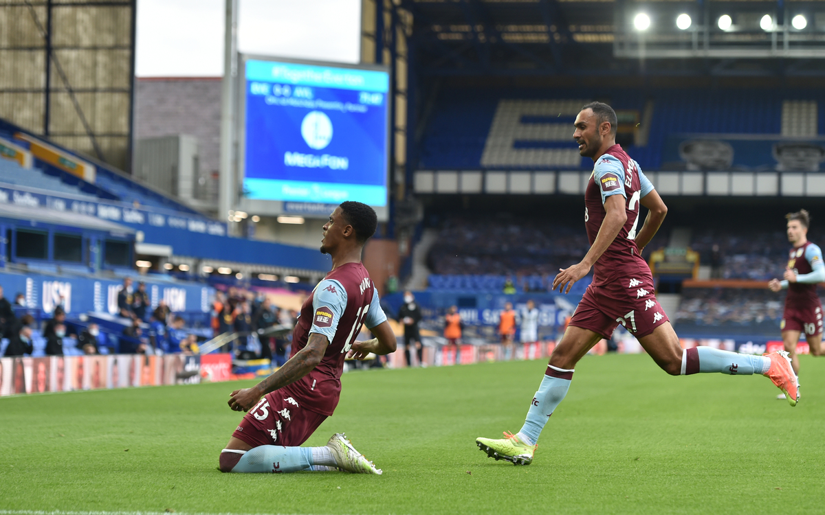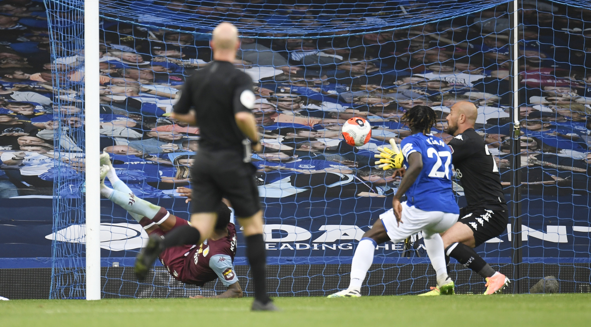 Soccer Football - Premier League - Everton v Aston Villa - Goodison Park, Liverpool, Britain - July 16, 2020 Aston Villa's Ezri Konsa scores their first goal, as play resumes behind closed doors following the outbreak of the coronavirus disease (COVID-19) Pool via REUTERS/Clive Brunskill