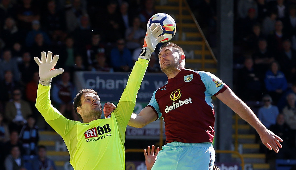 Soccer Football - Premier League - Burnley vs AFC Bournemouth - Turf Moor, Burnley, Britain - May 13, 2018 Bournemouth's Asmir Begovic in action with Burnley's Sam Vokes REUTERS/Andrew Yates