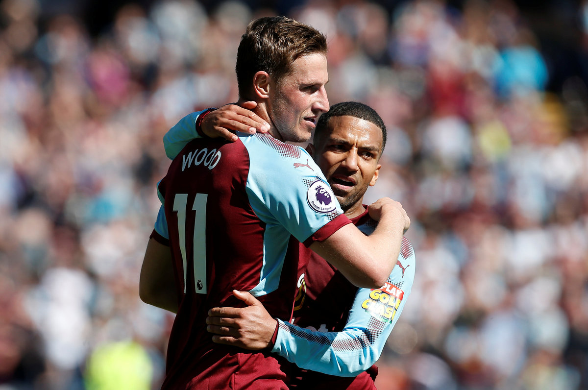 Soccer Football - Premier League - Burnley vs AFC Bournemouth - Turf Moor, Burnley, Britain - May 13, 2018 Burnley's Chris Wood celebrates with Aaron Lennon after scoring their first goal Action Images via Reuters/Craig Brough Soccer Football - Premier League - Burnley vs AFC Bournemouth - Turf Moor, Burnley, Britain - May 13, 2018 Bournemouth's Joshua King scores their first goal Action Images via Reuters/Craig Brough