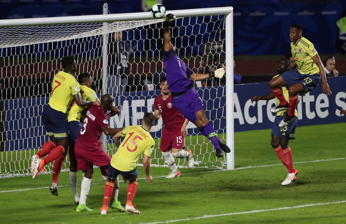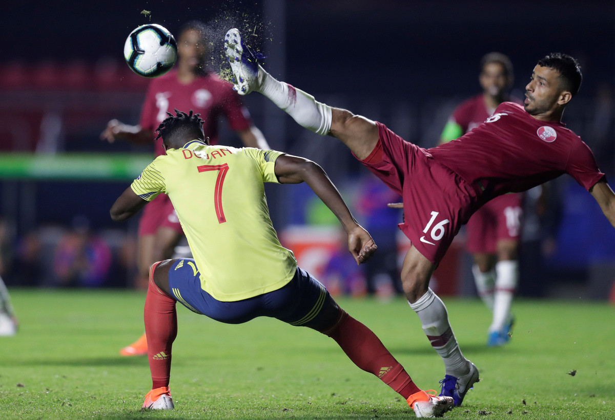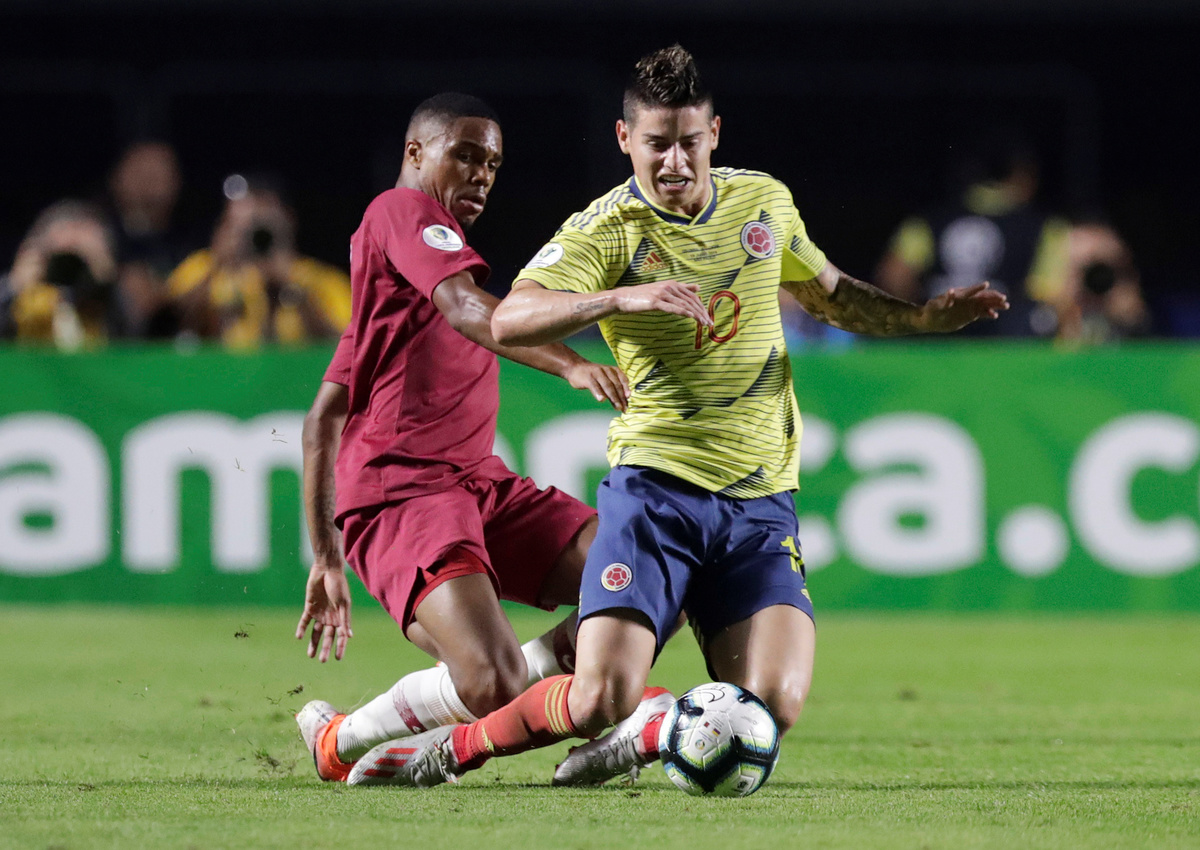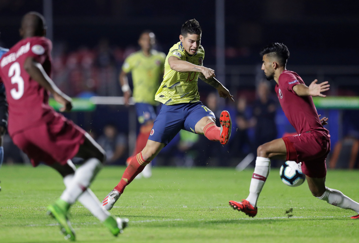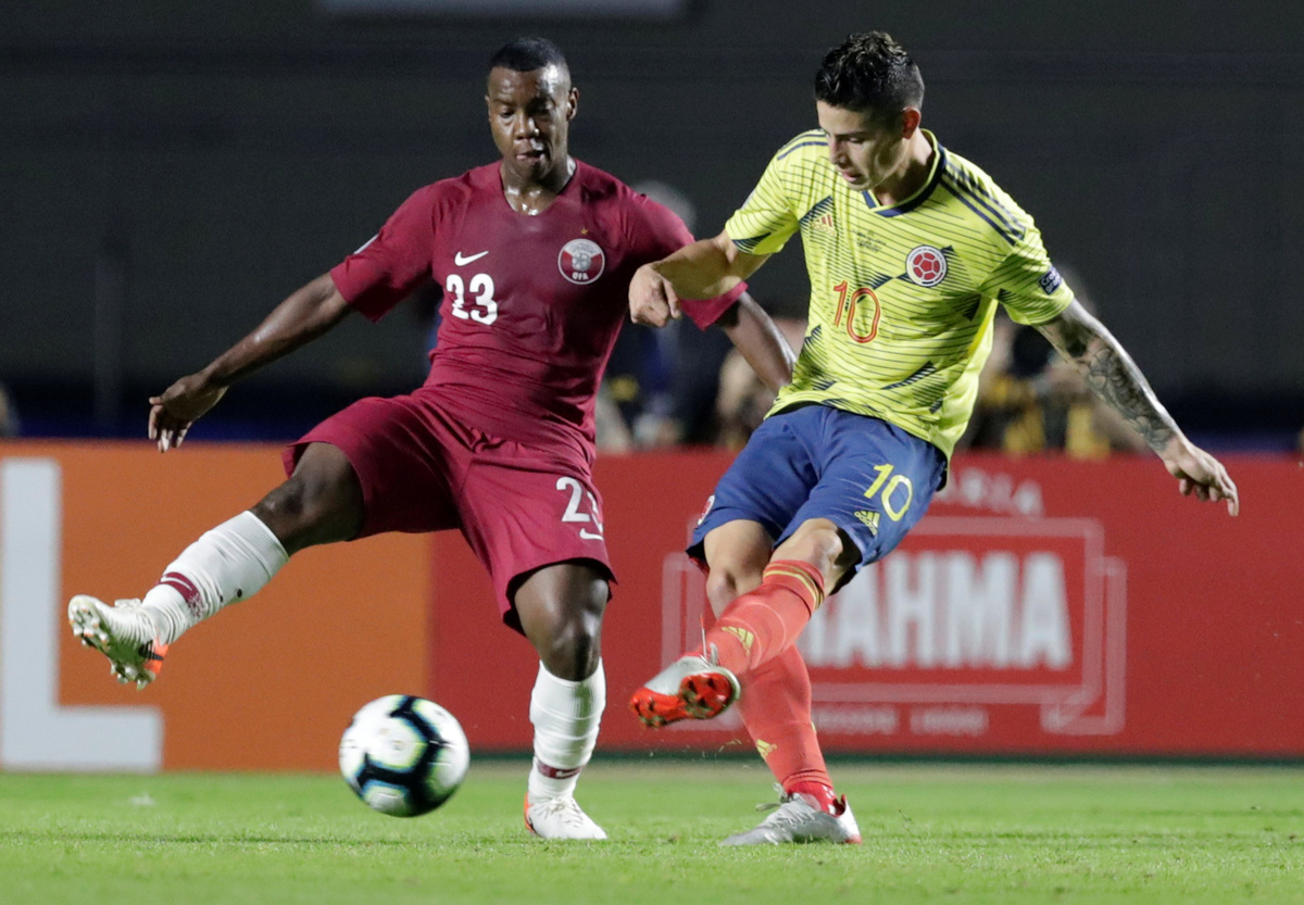 Soccer Football - Copa America Brazil 2019 - Group B - Colombia v Qatar - Morumbi Stadium, Sao Paulo, Brazil - June 19, 2019 Colombia's James Rodriguez shoots at goal REUTERS/Ueslei MarcelinoSoccer Football - Copa America Brazil 2019 - Group B - Colombia v Qatar - Morumbi Stadium, Sao Paulo, Brazil - June 19, 2019 Qatar's Boualem Khoukhi in action with Colombia's Duvan Zapata REUTERS/Ueslei MarcelinoSoccer Football - Copa America Brazil 2019 - Group B - Colombia v Qatar - Morumbi Stadium, Sao Paulo, Brazil - June 19, 2019 Qatar's Boualem Khoukhi in action REUTERS/Ueslei MarcelinoSoccer Football - Copa America Brazil 2019 - Group B - Colombia v Qatar - Morumbi Stadium, Sao Paulo, Brazil - June 19, 2019 Qatar's Saad Alsheeb in action with Colombia's Yerry Mina REUTERS/Amanda Perobelli