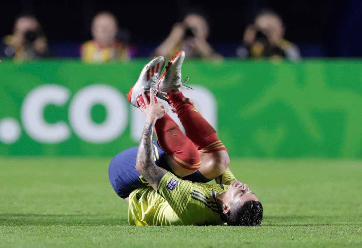 Soccer Football - Copa America Brazil 2019 - Group B - Colombia v Qatar - Morumbi Stadium, Sao Paulo, Brazil - June 19, 2019 Colombia's James Rodriguez down injured REUTERS/Henry Romero