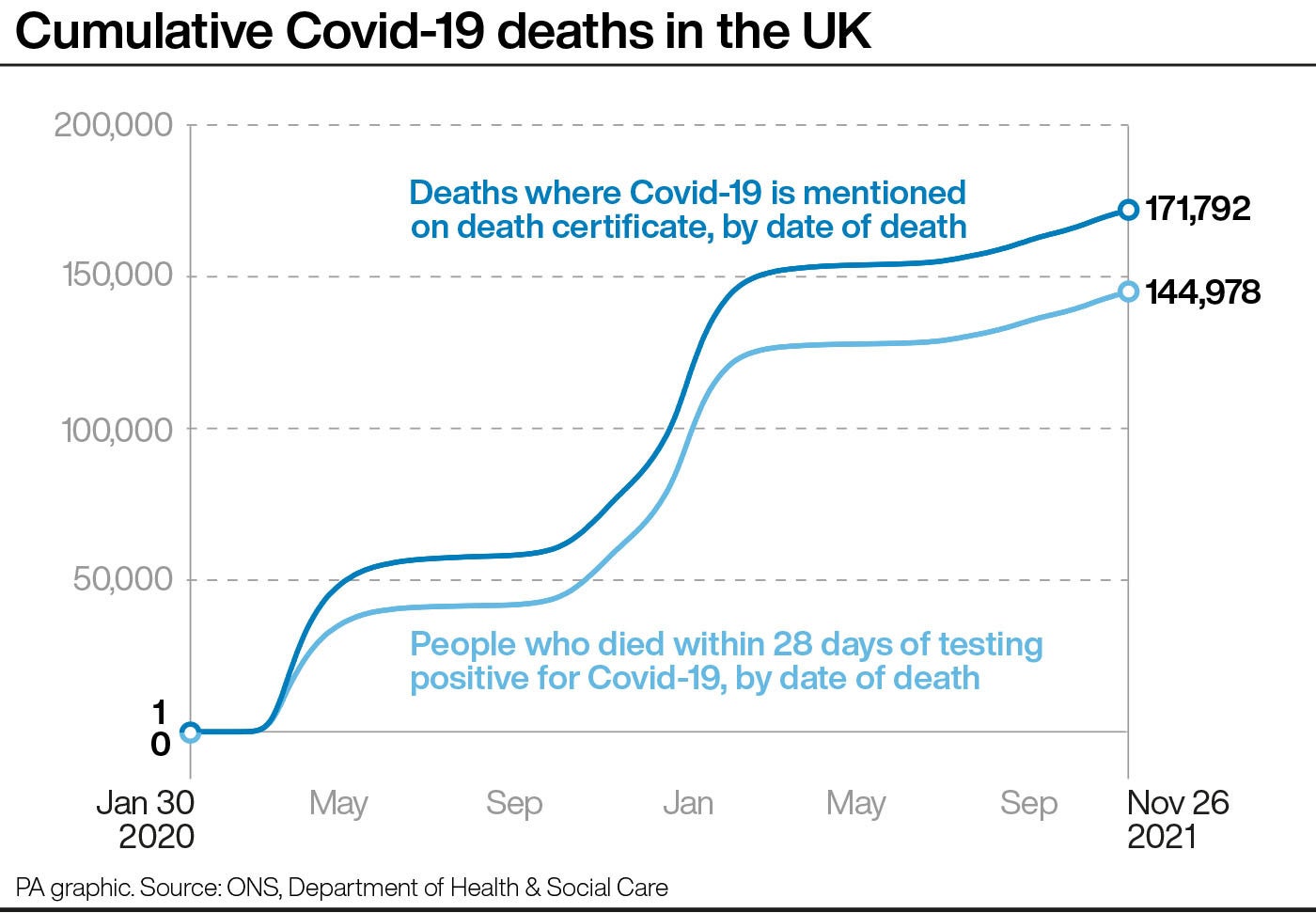 The list has been calculated by the PA news agency using data published on December 7 on the Government’s coronavirus dashboard.