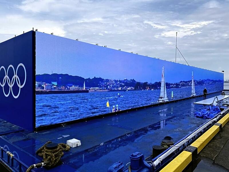 For the sailing events, NTT Corp. and other companies teamed up to float a 55-meter-wide, 2-meter-high display offshore in front of the competition venue. High-resolution images taken by special boats and drones were combined in real time using artificial intelligence and instantly transmitted to the screen.