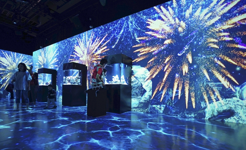 The theme of the event is "Japanese summer." The state-of-the-art technology, in which images of fireworks are projected on the whole of a wall and colors illuminating fish tanks change to music, are used to create a fantastical space. A 47-year-old company employee from Kawasaki who came with his 1-year-old daughter said, "The fish look prettier with this vivid production."