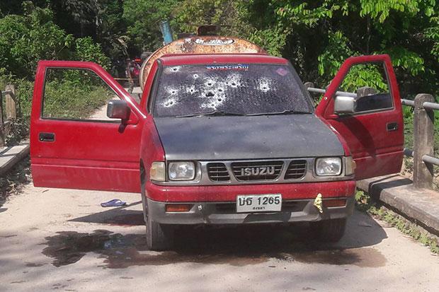 The attack occurred at a bridge in Ban Phruja village of tambon Nod at around 8.45am on Saturday. Police and soldiers went to the scene and found the bullet-ridden red pickup truck on the bridge.