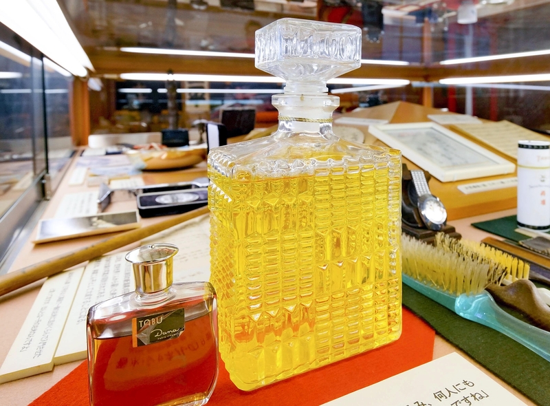 She said that Sanpei loved making people laugh in his private life too. One of the exhibits is a luxury perfume in a liquor decanter. Sanpei tried to make people believe it was a foreign liquor and drink it.
