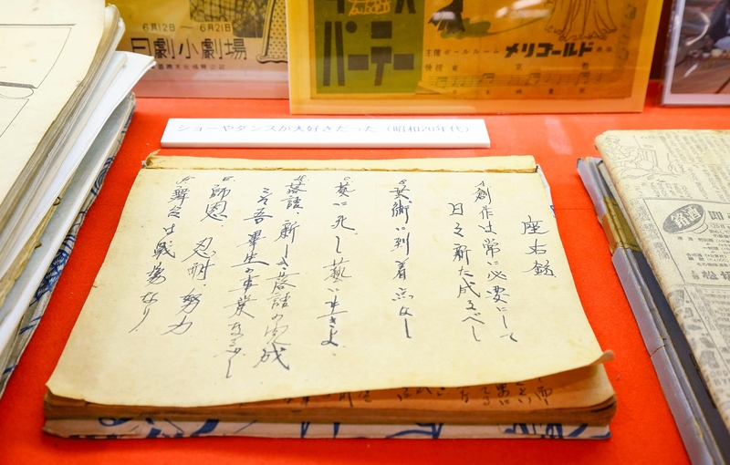 His handwritten mottoes are also on display. One is "Gei ni Shishi, Gei ni Ikiyo" (Die for performances, Live for performances).
