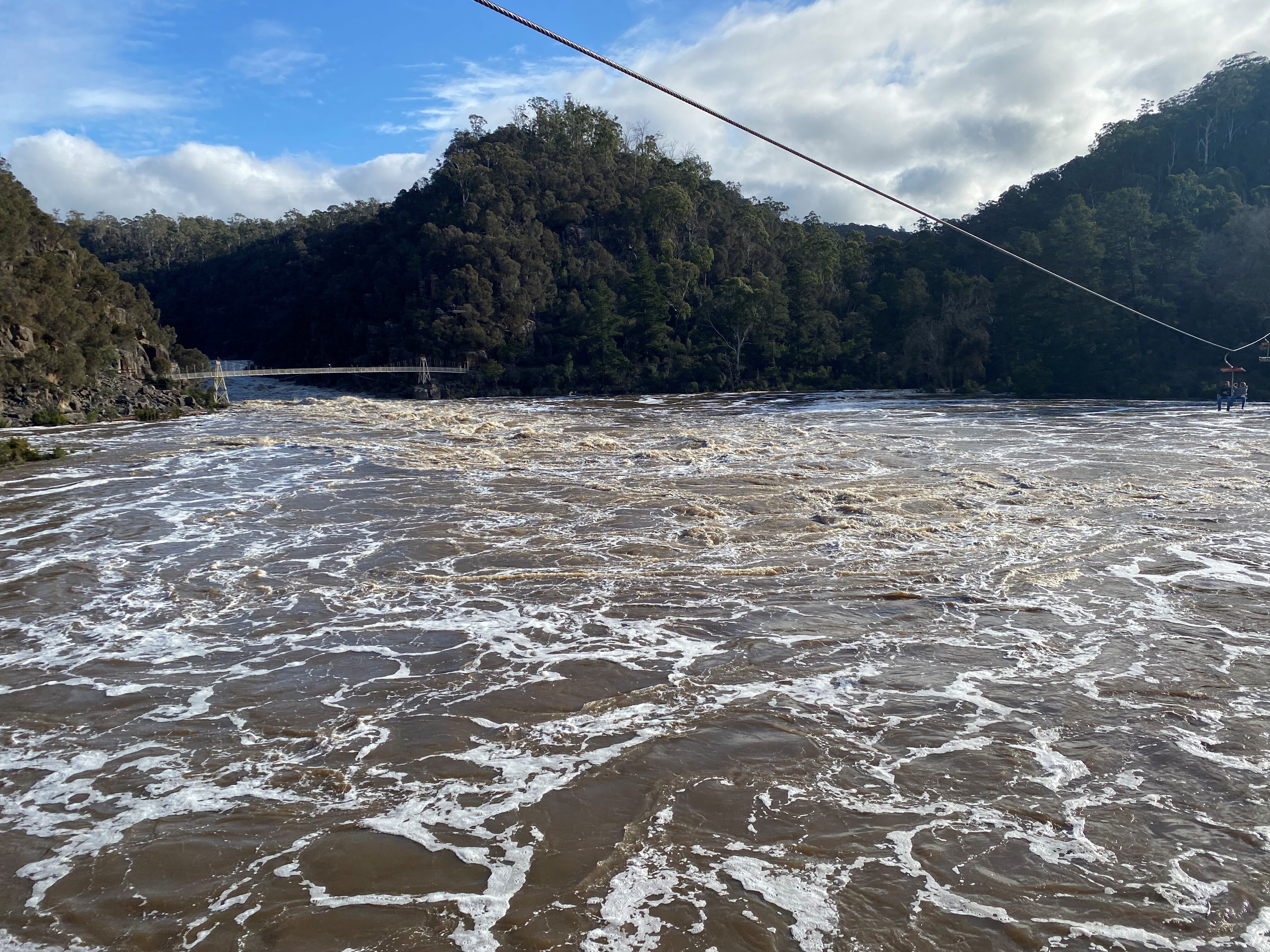 It wasn't as bad as 2016, but heavy rains have again transformed a popular Tasmanian swimming spot into a raging torrent, with a mother and daughter pair's chairlift ride turning into a "terrifying" ordeal.