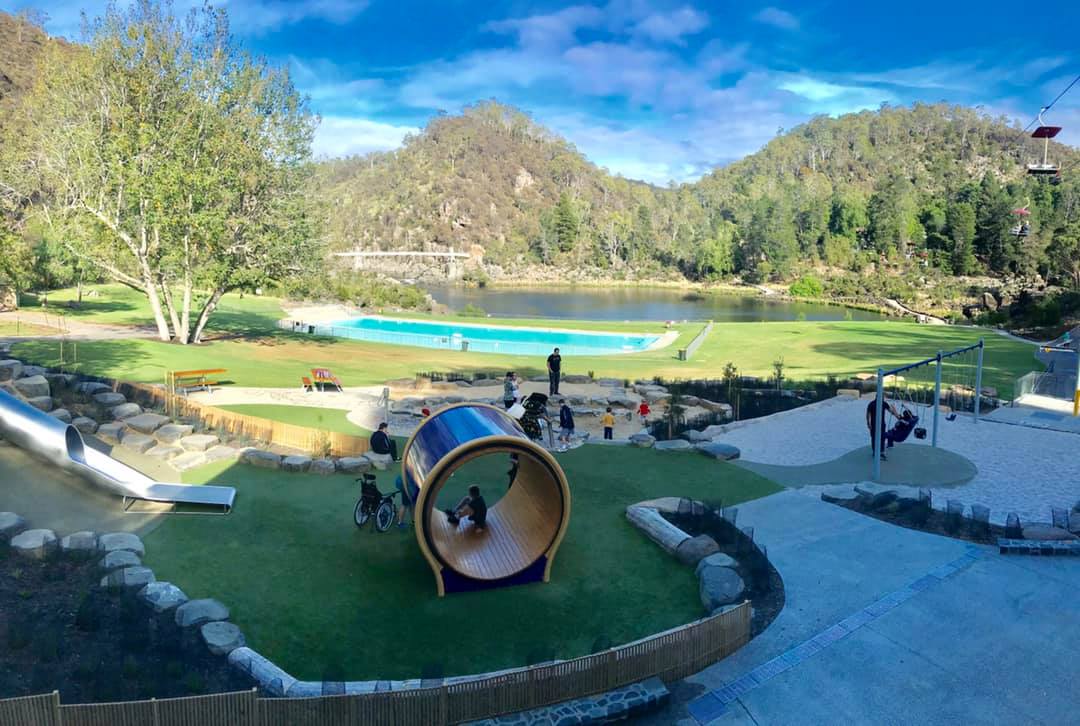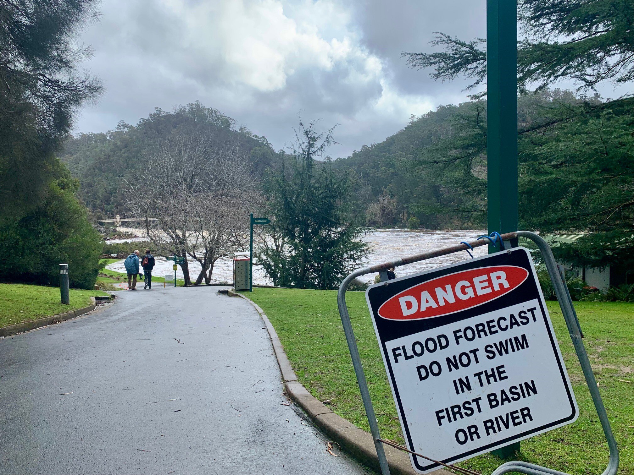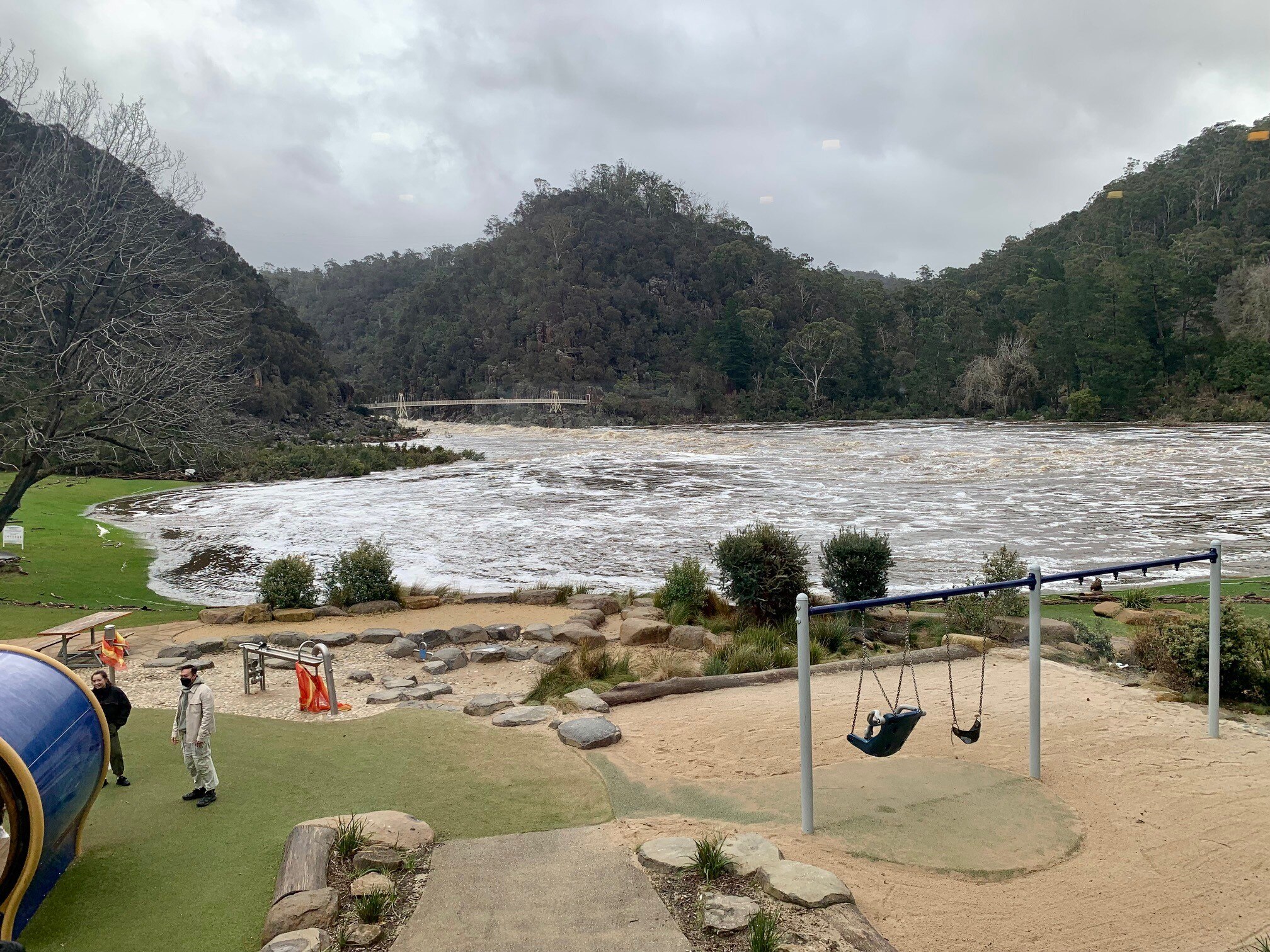 Water levels in the popular tourist attraction peaked overnight, swallowing the swimming pool and coming up to the playground, fed by the South Esk River.