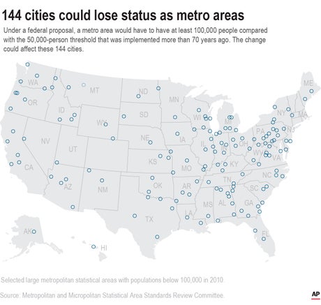The request comes after The Associated Press reported this month that the federal government is contemplating raising the population criteria for core cities in metro areas from 50,000 residents to 100,000 residents. Doing so would reclassify more than a third of the current 392 metro areas as micropolitan statistical areas.