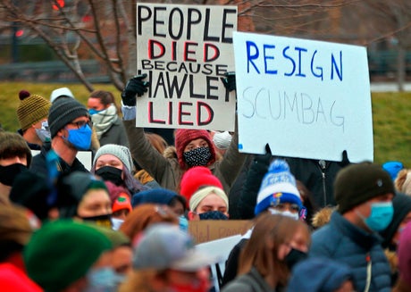 In St. Louis on Saturday, several hundred people protested against Sen. Josh Hawley, the first-term Missouri Republican who led efforts in the Senate to overturn Biden's election. The protestors painted “RESIGN HAWLEY” in large yellow letters in the middle of the street.