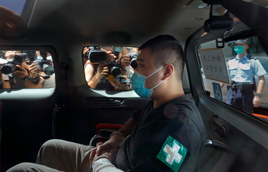 Tong Ying-kit was convicted Tuesday of inciting secession and terrorism for driving his motorcycle into a group of police officers during a July 1, 2020, pro-democracy rally while carrying a flag bearing the banned slogan, “Liberate Hong Kong revolution of our times.”
