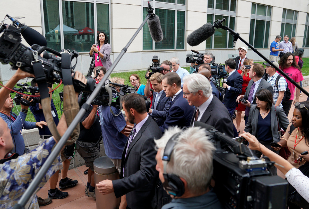 Taylor Swift attorney Douglas Baldridge (C) speaks to the media after the verdict came in at Denver Federal Court in the Taylor Swift groping trial in Denver, U.S. August 14, 2017. REUTERS/Rick Wilking