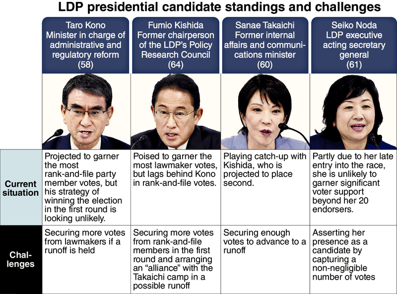 Kono has said that he will do his best to win outright with a majority and avoid a runoff. His camp, though, has fixed its sights on a runoff. The strategy is to engage public opinion by presenting Shigeru Ishiba, a former LDP secretary general, and Environment Minister Shinjiro Koizumi, both popular figures, at the forefront of the campaign, thus exerting mental pressure on Diet members conscious of the upcoming lower house election.
