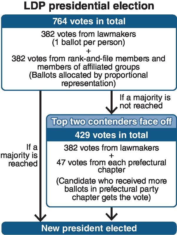 A runoff between the top two candidates will be heavily weighted toward LDP Diet members, as they retain 382 votes, while the rank-and-file votes will be whittled down to 47 votes, one for each LDP prefectural chapter.