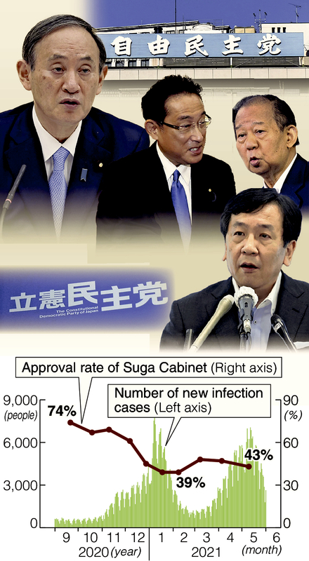 In a Yomiuri Shimbun public opinion survey conducted in early May, the Suga Cabinet had a disapproval rating of 46%, which surpassed the approval rating (43%) for the first time in three months.