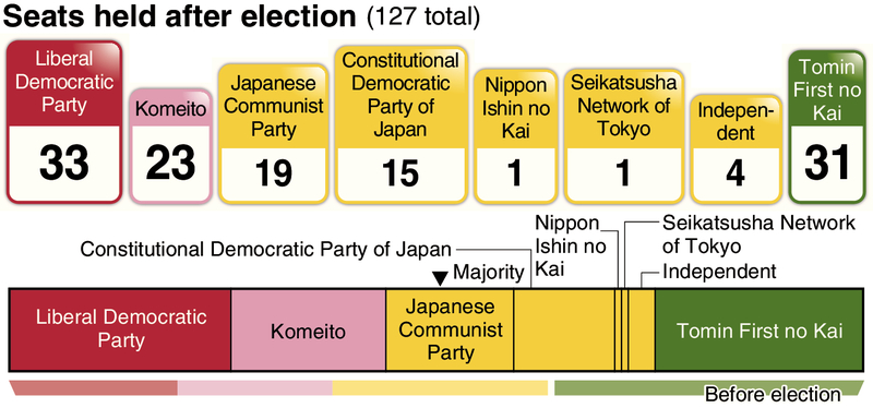 Tomin ultimately won three seats in single-seat constituencies, including a victory in the fiercely contested Chiyoda Ward, but was unable to maintain its position as the No. 1 party.