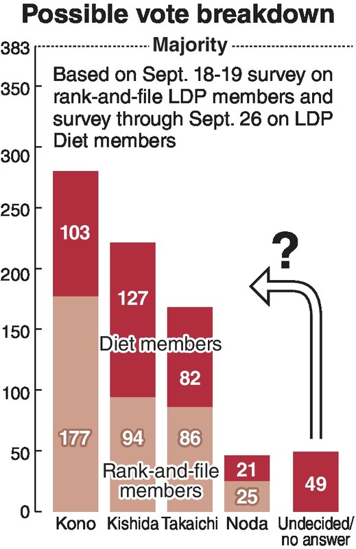 Extrapolating that survey's responses to fill 382 rank-and-file votes, Kono would have 177 additional votes, Kishida 94, Takaichi 86 and Noda 25. Based on the surveys, the total votes would be 280 for Kono, 221 for Kishida, 168 for Takaichi and 46 for Noda, suggesting that even if Kono receives all the support from the 49 Diet members who have not decided or responded, he will still receive under the 383 needed for a majority.
