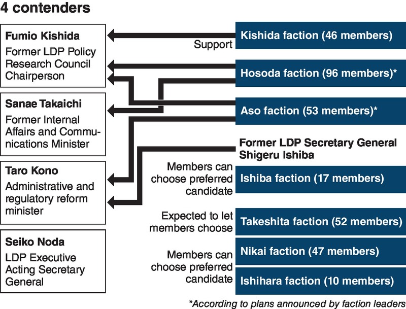 According to a Yomiuri Shimbun survey of LDP lawmakers, the election is shaping up as a three-horse race between former LDP Policy Research Council Chairperson Fumio Kishida, administrative and regulatory reform minister Taro Kono, and former Internal Affairs and Communications Minister Sanae Takaichi, with LDP Executive Acting Secretary General Seiko Noda trailing at this stage.