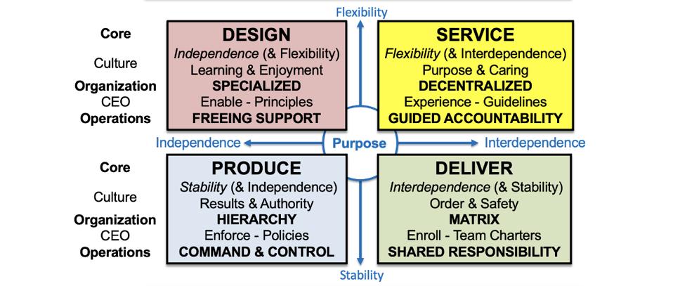 Mergers are major points of inflection. The core nature of the business across design, produce, service, or deliver drives every other choice. Pay particular attention to the cultural integration, merging one culture into the other (more straightforward) or combining them to make something entirely new (more complex and risky.)