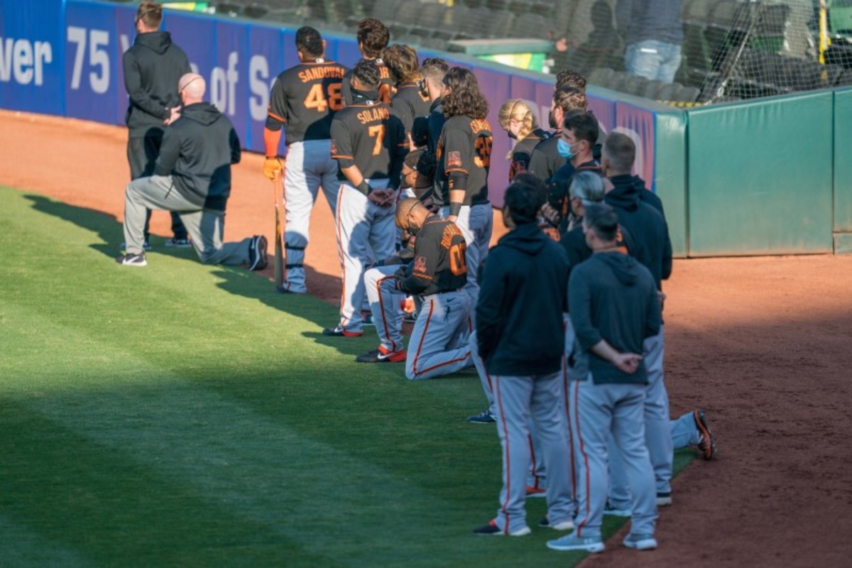 Members of Major League Baseball's San Francisco Giants took a knee during the anthem ahead of an exhibition game on Monday, leading U.S. President Donald Trump on Tuesday to renew his criticism of the protests.