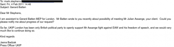 The office of UKIP MEP Gerard Batten contacted Assange's lawyer Mark Stephens about "the possibility of meeting Mr Julian Assange."