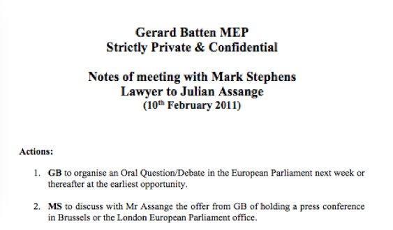 Leaked minutes of a subsequent meeting between Batten and Stephens reveal that Batten promised to table a motion in support of the WikiLeaks founder in the European Parliament. The party also offered the opportunity of a joint video press conference in Brussels.