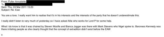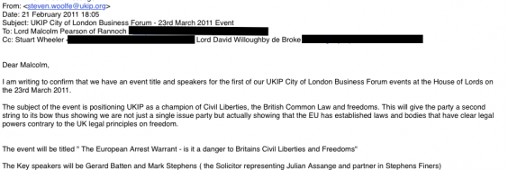 A month later, the party organised a House of Lords event on the European Arrest Warrant with Assange's lawyer as the star guest.