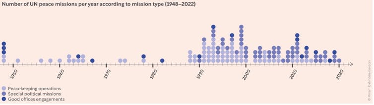 Research by teams at the Geneva Graduate Institute and at ETH Zurich shows that more than 140 UN peace missions – ranging from traditional peacekeeping to special political missions and good offices engagements – have been deployed globally since the UN’s creation in 1945. The number of missions, their types, and their objectives have changed greatly over time and space, due to changes in the nature of conflicts and in the international environment.
