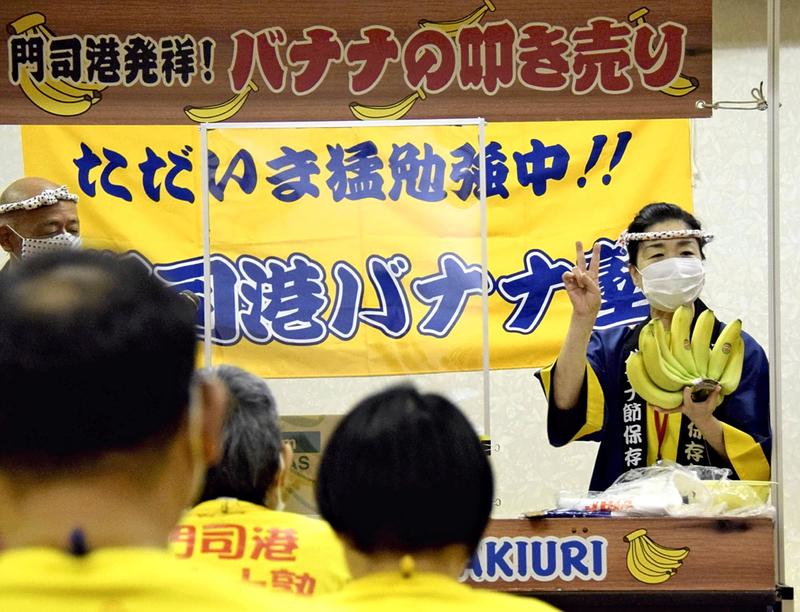 Kitakyushu's Moji Port is said to be the birthplace of "banana no tatakiuri," a sales method using performers to sell bananas at low prices. A school there teaches the techniques that used to be regularly seen in places selling the fruit.
