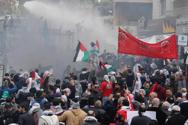 Some protestors burned an effigy of the US President, as well as American and Israeli flags and piles of garbage, sending plumes of smoke into the air. As they hurled stones, security forces responded with tear gas and water cannons, TV footage showed.