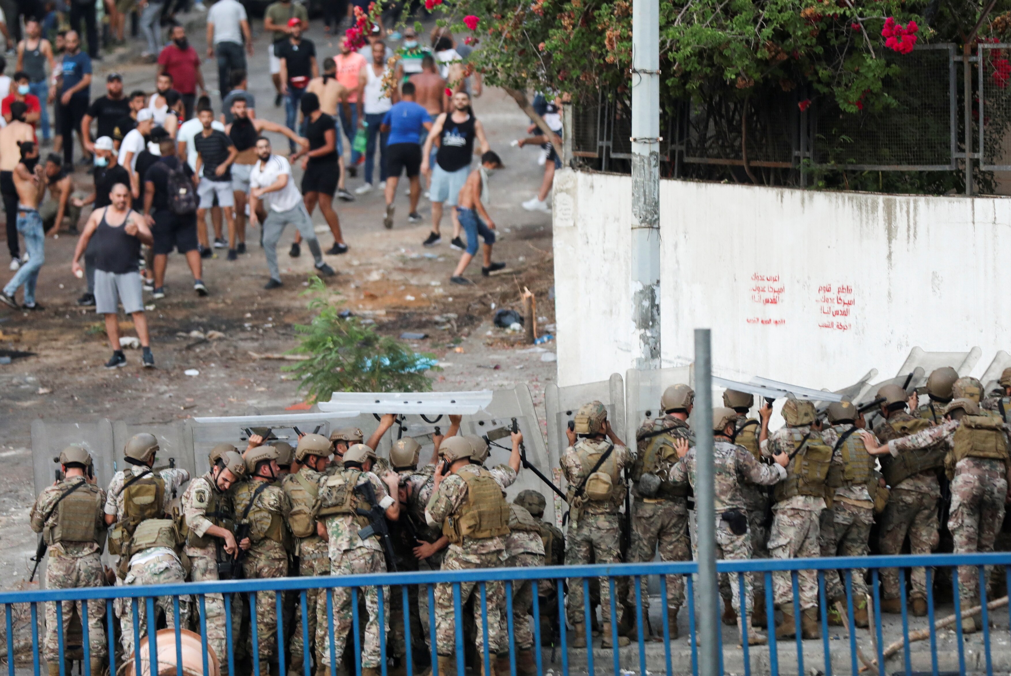 Troops deployed to break up a protest at the edge of Beirut fired in the air and used armoured vehicles to open roads. Protesters pelted the soldiers with stones.