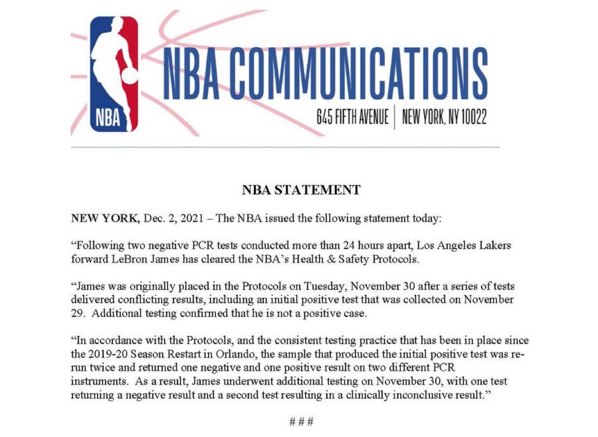 NBA statement on LeBron James, who has cleared the NBA’s Health and Safety protocols after having two negative PCR tests pic.twitter.com/7uwItkjgrE – 6:14 PM