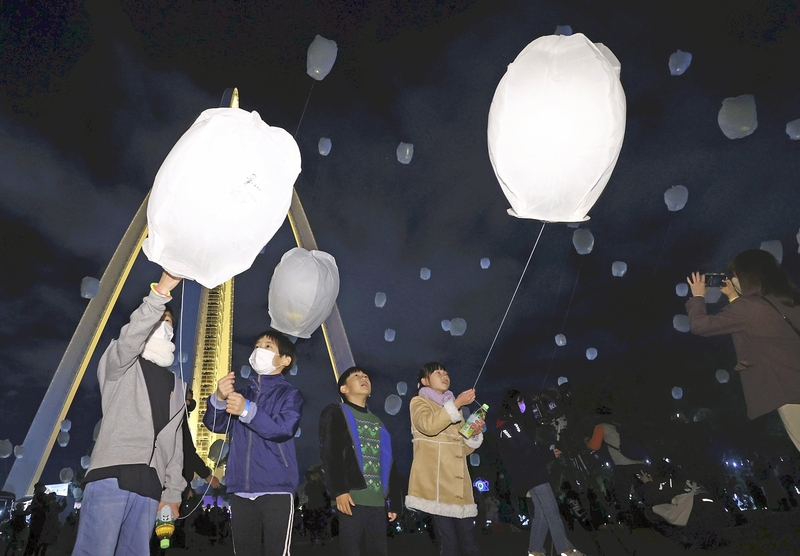 About 100 helium-filled lanterns on strings, lit from within by LEDs and carrying written wishes such as "May the coronavirus go away," floated in the night sky in Ichinomiya, Aichi Prefecture, on Tuesday, commemorating the 100th anniversary of the city's establishment. The event took place at 138 Tower Park, which itself is part of Kiso Sansen National Government Park. The lanterns went up en masse at 6 p.m., creating a fantastic landscape of soft light.