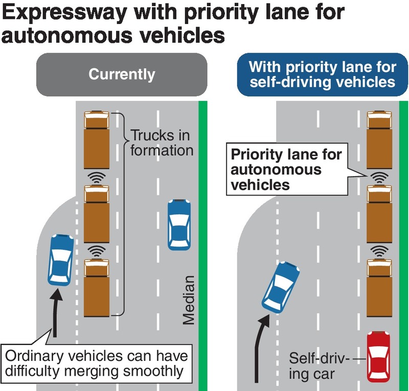 The transport ministry plans to set up priority lanes for self-driving vehicles on some sections of expressways and other general roads, The Yomiuri Shimbun has learned.