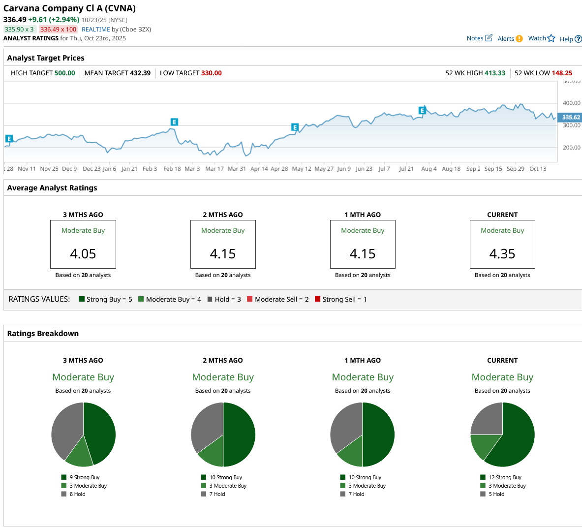 If CVNA stock is priced at 30x forward FCF, it should double within the next four years. Out of 20 analysts covering the stock, 12 recommend “Strong Buy,” three recommend “Moderate Buy,” and five recommend “Hold.” The average CVNA stock price target is $429, above the current price of $336.