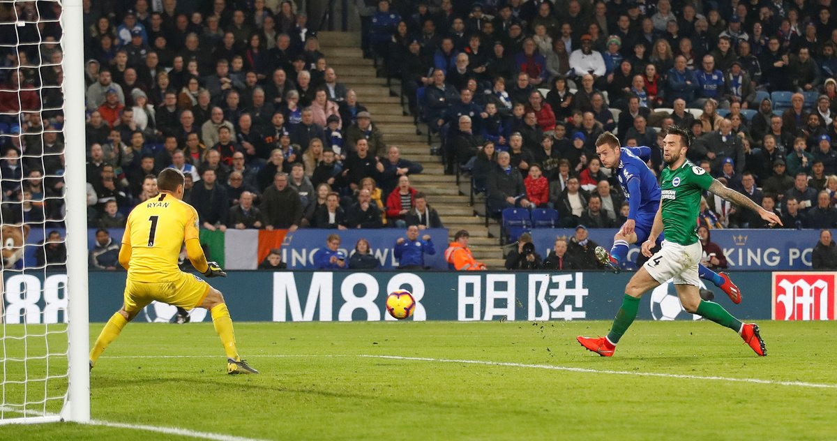 Glenn Murray had the goal at his mercy but lashed a shot over the bar and that miss was punished just past the hour when James Maddison found Vardy and the England striker smashed a low shot past Ryan to double Leicester's lead.