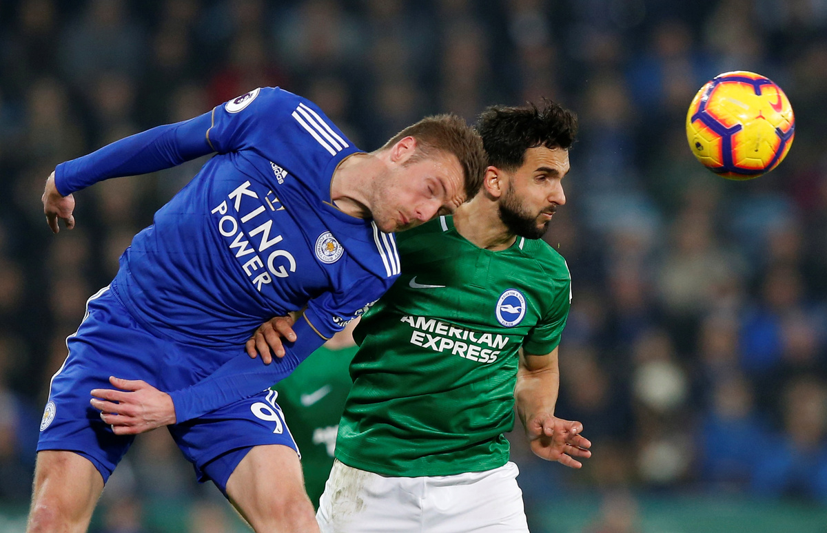 Soccer Football - Premier League - Leicester City v Brighton & Hove Albion - King Power Stadium, Leicester, Britain - February 26, 2019 Brighton's Martin Montoya in action with Leicester City's Jamie Vardy REUTERS/Andrew Yates