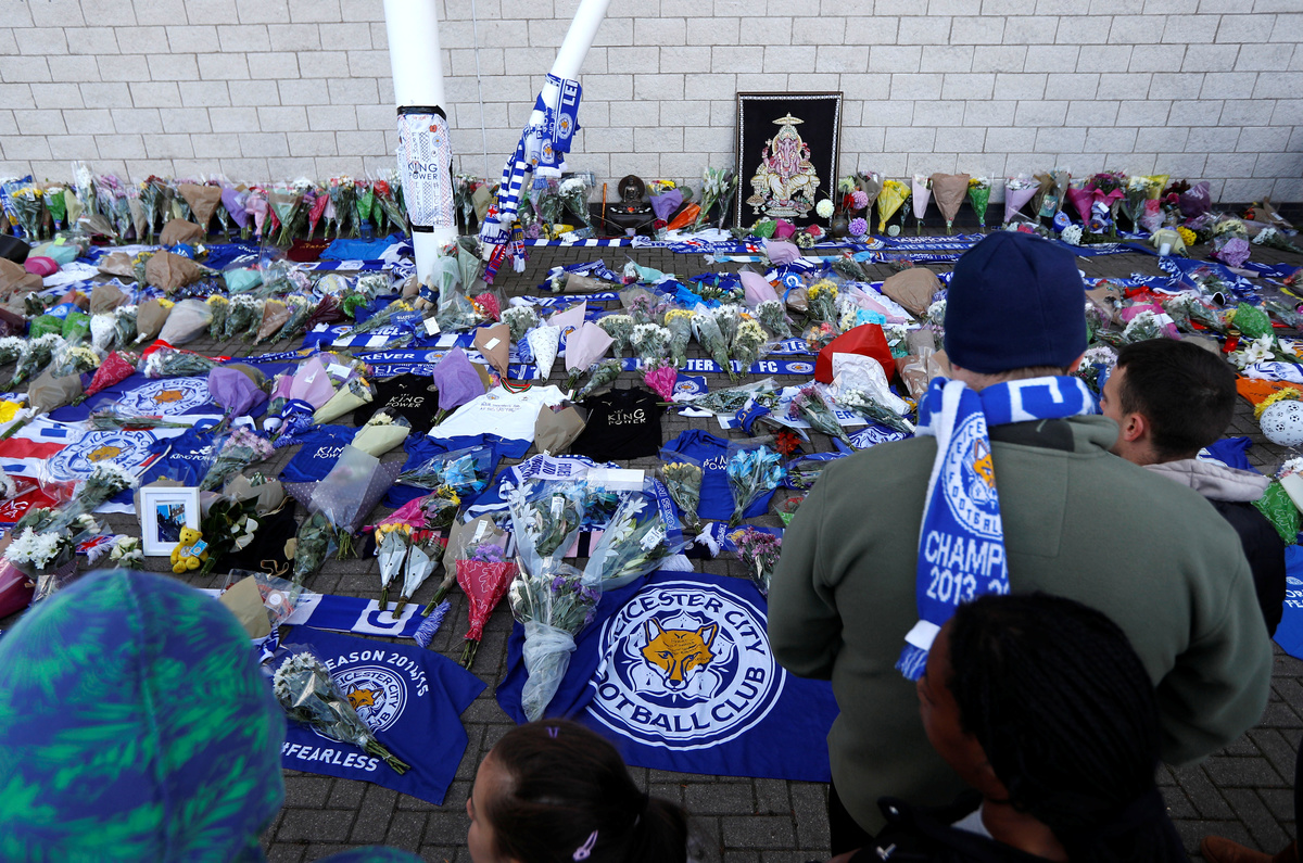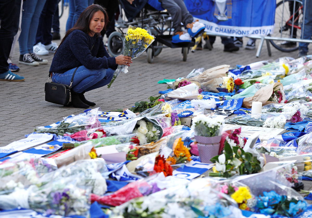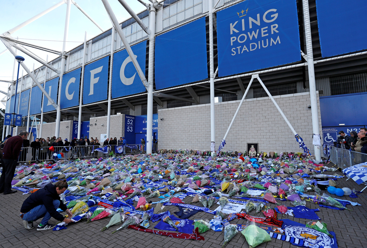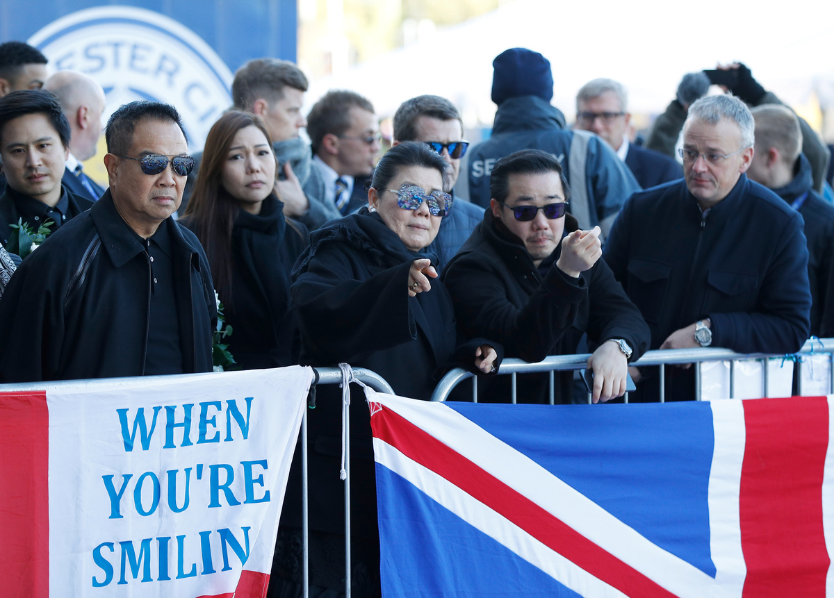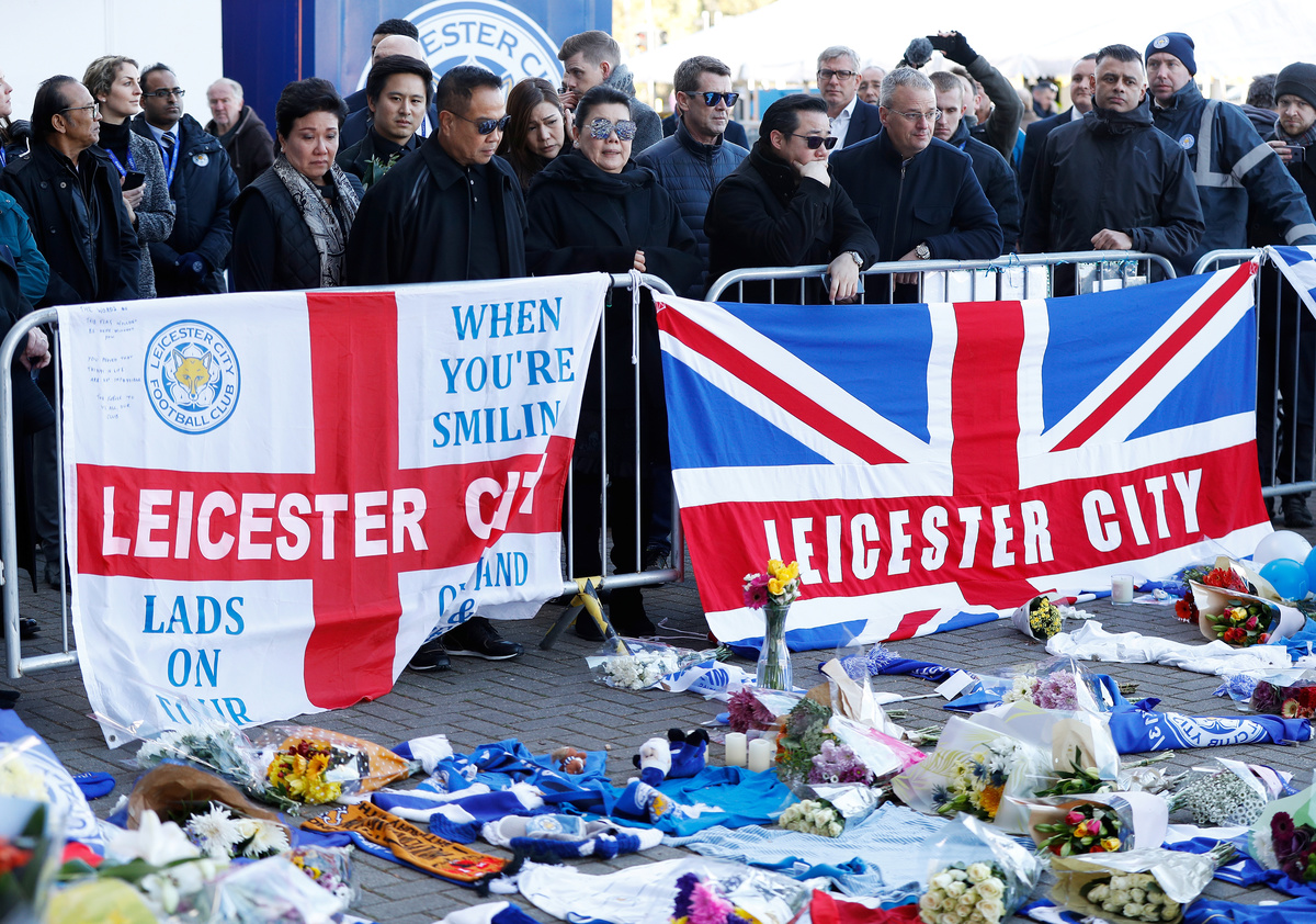 Leicester City staff embrace outside the football stadium, after the club's owner Thai businessman Vichai Srivaddhanaprabha and four other people died when the helicopter they were travelling in crashed as it left the ground after the match on Saturday, in Leicester, Britain, October 29, 2018. REUTERS/Peter NichollsFILE PHOTO - Vichai Srivaddhanaprabha, owner of football club Leicester City attends a meeting with the media in Bangkok, Thailand May 18, 2016. REUTERS/Jorge Silva/File PhotoVisitors take photos in front of a mural representing Leicester City owner Vichai Srivaddhanaprabha, after the helicopter of the club owner crashed when leaving the ground on Saturday evening after their match, in the centre of Leicester, Britain, October 28, 2018. REUTERS/Peter NichollsMessages and flowers can be seen placed outside Leicester City football stadium after the helicopter of the club owner Thai businessman Vichai Srivaddhanaprabha crashed when leaving the ground on Saturday evening after the match, in Leicester, Britain, October 28, 2018. REUTERS/Peter NichollsLeicester City football fans pay their respects outside the football stadium, after the helicopter of the club owner Thai businessman Vichai Srivaddhanaprabha crashed when leaving the ground on Saturday evening after the match, in Leicester, Britain, October 28, 2018. REUTERS/Peter NichollsLeicester City football fans pay their respects outside the football stadium, after the helicopter of the club owner Thai businessman Vichai Srivaddhanaprabha crashed when leaving the ground on Saturday evening after the match, in Leicester, Britain, October 28, 2018. REUTERS/Peter NichollsFILE PHOTO - Vichai Srivaddhanaprabha, owner of football club Leicester City arrives at a meeting with the media in Bangkok, Thailand May 18, 2016. REUTERS/Jorge Silva/File PhotoLeicester City football fans pay their respects outside the football stadium, after the helicopter of the club owner Thai businessman Vichai Srivaddhanaprabha crashed when leaving the ground on Saturday evening after the match, in Leicester, Britain, October 28, 2018. REUTERS/Peter NichollsLeicester City football fans pay their respects outside the football stadium, after the helicopter of the club owner Thai businessman Vichai Srivaddhanaprabha crashed when leaving the ground on Saturday evening after the match, in Leicester, Britain, October 28, 2018. REUTERS/Peter NichollsLeicester City football fans pay their respects outside the football stadium, after the helicopter of the club owner Thai businessman Vichai Srivaddhanaprabha crashed when leaving the ground on Saturday evening after the match, in Leicester, Britain, October 28, 2018. REUTERS/Peter NichollsPolice officers seal off an area of Leicester City football stadium, after the helicopter of the club owner Thai businessman Vichai Srivaddhanaprabha crashed when leaving the ground on Saturday evening after the match, in Leicester, Britain, October 28, 2018. REUTERS/Peter NichollsLeicester City football fans pay their respects outside the football stadium, after the helicopter of the club owner Thai businessman Vichai Srivaddhanaprabha crashed when leaving the ground on Saturday evening after the match, in Leicester, Britain, October 28, 2018. REUTERS/Peter NichollsA sign can be seen at Leicester City football stadium, after the helicopter of the club owner Thai businessman Vichai Srivaddhanaprabha crashed when leaving the ground on Saturday evening after the match, in Leicester, Britain, October 28, 2018. REUTERS/Peter NichollsMessages and flowers can be seen placed outside Leicester City football stadium after the helicopter of the club owner Thai businessman Vichai Srivaddhanaprabha crashed when leaving the ground on Saturday evening after the match, in Leicester, Britain, October 28, 2018. REUTERS/Peter NichollsMessages and flowers can be seen placed outside Leicester City football stadium after the helicopter of the club owner Thai businessman Vichai Srivaddhanaprabha crashed when leaving the ground on Saturday evening after the match, in Leicester, Britain, October 28, 2018. REUTERS/Peter NichollsLeicester City football fans place flowers outside the football stadium after the helicopter of the club owner Thai businessman Vichai Srivaddhanaprabha crashed when leaving the ground on Saturday evening after the match, in Leicester, Britain, October 28, 2018. REUTERS/Peter NichollsPeople walk at the King Power head office in Bangkok, Thailand October 28, 2018. REUTERS/Soe Zeya TunA woman walks in front of the King Power head office in Bangkok, Thailand October 28, 2018. REUTERS/Soe Zeya TunFILE PHOTO - Vichai Srivaddhanaprabha, owner of football club Leicester City, stands on stage next to the club's English Premier League trophy during a meeting with the media in Bangkok, Thailand May 18, 2016. REUTERS/Jorge Silva/File Photo