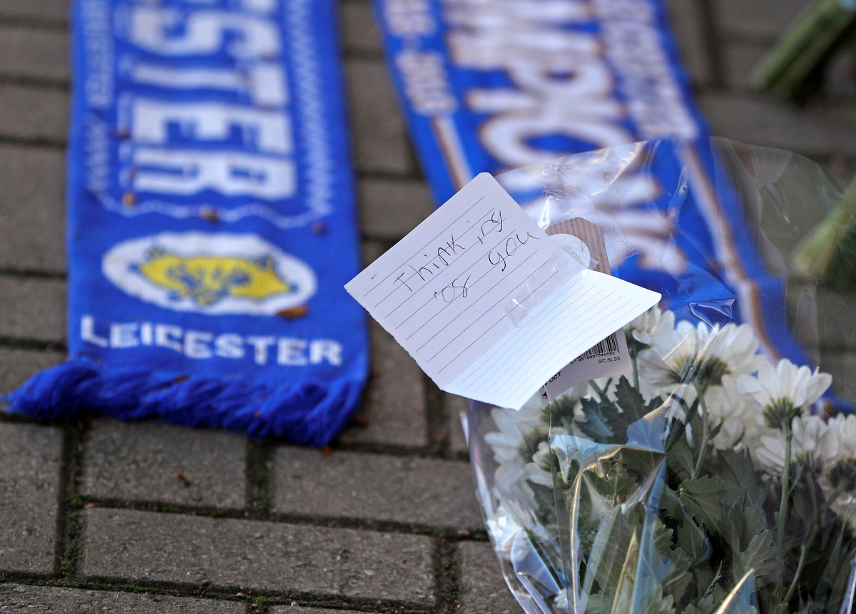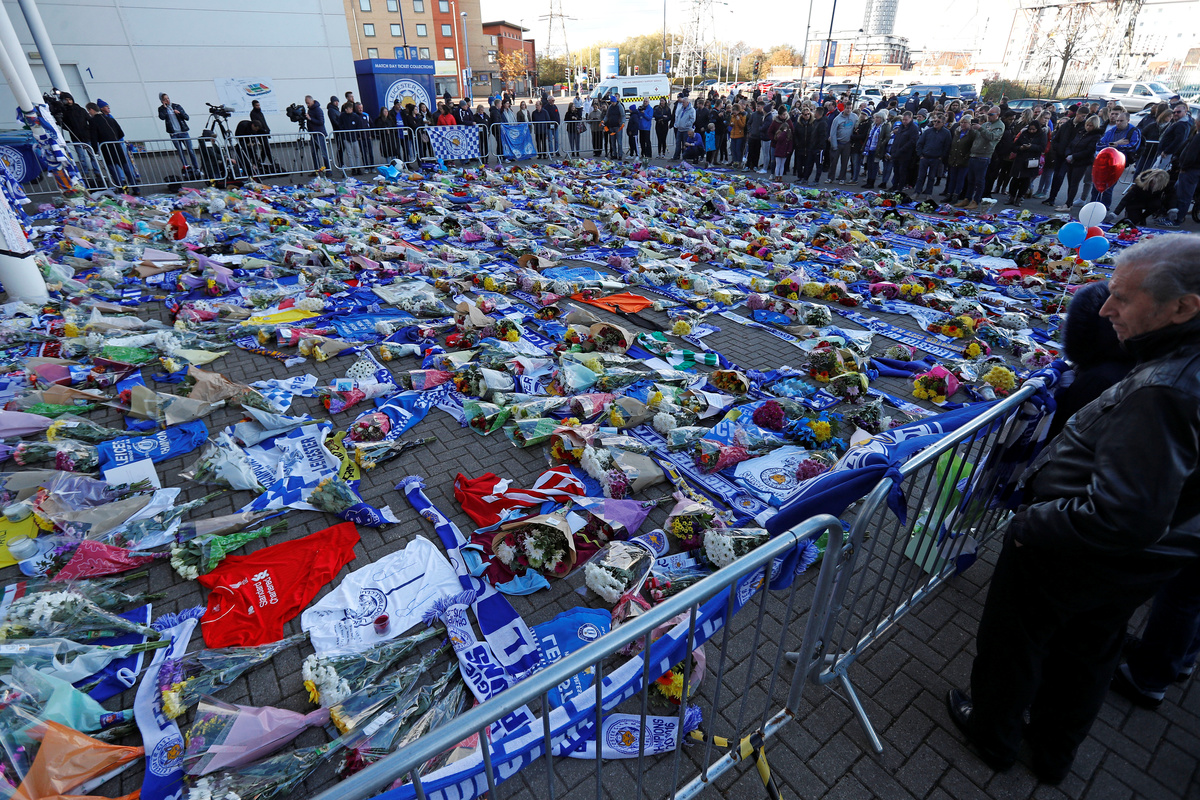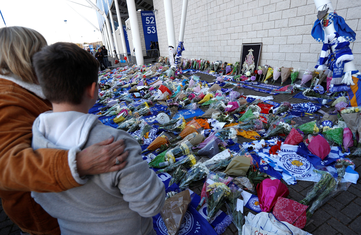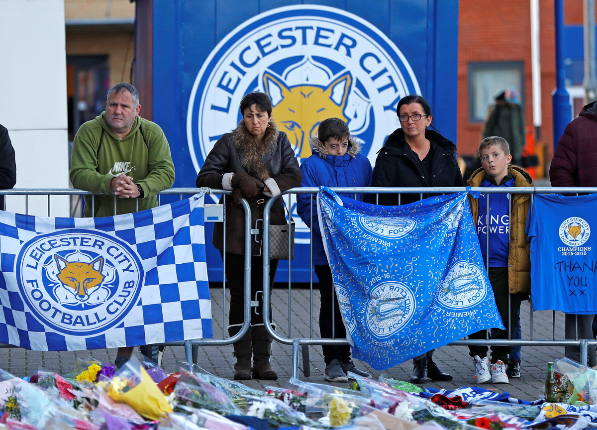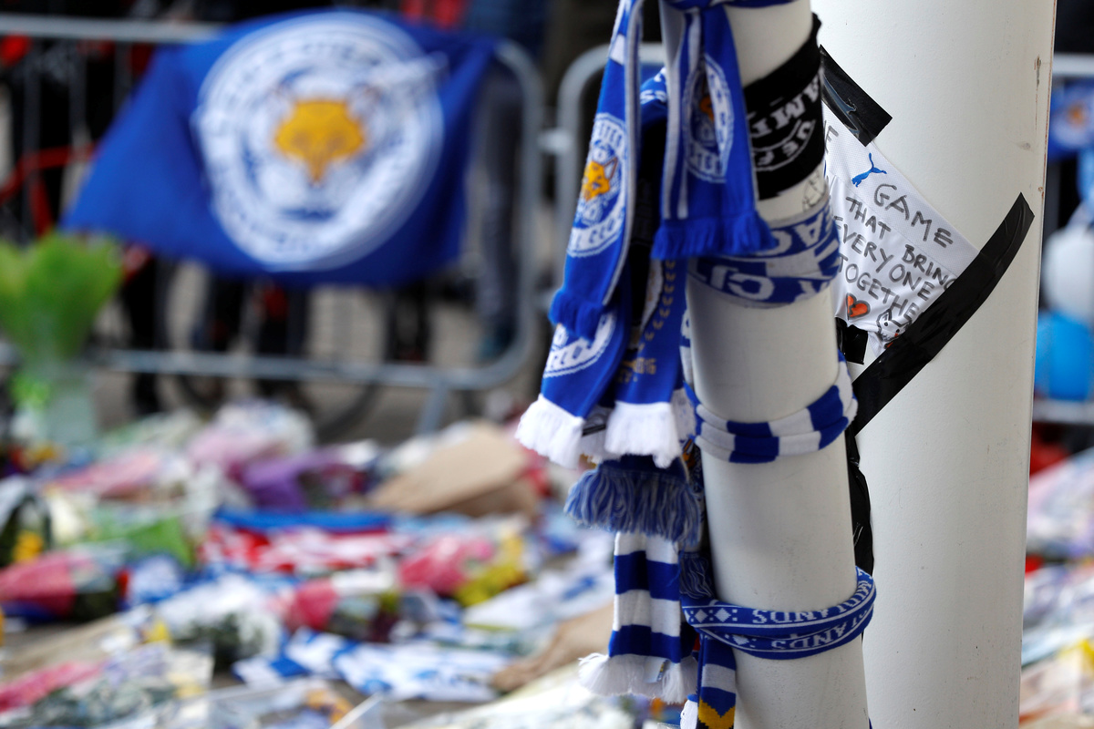 Leicester City staff embrace outside the football stadium, after the club's owner Thai businessman Vichai Srivaddhanaprabha and four other people died when the helicopter they were travelling in crashed as it left the ground after the match on Saturday, in Leicester, Britain, October 29, 2018. REUTERS/Peter NichollsFILE PHOTO - Vichai Srivaddhanaprabha, owner of football club Leicester City attends a meeting with the media in Bangkok, Thailand May 18, 2016. REUTERS/Jorge Silva/File PhotoVisitors take photos in front of a mural representing Leicester City owner Vichai Srivaddhanaprabha, after the helicopter of the club owner crashed when leaving the ground on Saturday evening after their match, in the centre of Leicester, Britain, October 28, 2018. REUTERS/Peter NichollsMessages and flowers can be seen placed outside Leicester City football stadium after the helicopter of the club owner Thai businessman Vichai Srivaddhanaprabha crashed when leaving the ground on Saturday evening after the match, in Leicester, Britain, October 28, 2018. REUTERS/Peter NichollsLeicester City football fans pay their respects outside the football stadium, after the helicopter of the club owner Thai businessman Vichai Srivaddhanaprabha crashed when leaving the ground on Saturday evening after the match, in Leicester, Britain, October 28, 2018. REUTERS/Peter NichollsLeicester City football fans pay their respects outside the football stadium, after the helicopter of the club owner Thai businessman Vichai Srivaddhanaprabha crashed when leaving the ground on Saturday evening after the match, in Leicester, Britain, October 28, 2018. REUTERS/Peter NichollsFILE PHOTO - Vichai Srivaddhanaprabha, owner of football club Leicester City arrives at a meeting with the media in Bangkok, Thailand May 18, 2016. REUTERS/Jorge Silva/File PhotoLeicester City football fans pay their respects outside the football stadium, after the helicopter of the club owner Thai businessman Vichai Srivaddhanaprabha crashed when leaving the ground on Saturday evening after the match, in Leicester, Britain, October 28, 2018. REUTERS/Peter NichollsLeicester City football fans pay their respects outside the football stadium, after the helicopter of the club owner Thai businessman Vichai Srivaddhanaprabha crashed when leaving the ground on Saturday evening after the match, in Leicester, Britain, October 28, 2018. REUTERS/Peter NichollsLeicester City football fans pay their respects outside the football stadium, after the helicopter of the club owner Thai businessman Vichai Srivaddhanaprabha crashed when leaving the ground on Saturday evening after the match, in Leicester, Britain, October 28, 2018. REUTERS/Peter NichollsPolice officers seal off an area of Leicester City football stadium, after the helicopter of the club owner Thai businessman Vichai Srivaddhanaprabha crashed when leaving the ground on Saturday evening after the match, in Leicester, Britain, October 28, 2018. REUTERS/Peter NichollsLeicester City football fans pay their respects outside the football stadium, after the helicopter of the club owner Thai businessman Vichai Srivaddhanaprabha crashed when leaving the ground on Saturday evening after the match, in Leicester, Britain, October 28, 2018. REUTERS/Peter NichollsA sign can be seen at Leicester City football stadium, after the helicopter of the club owner Thai businessman Vichai Srivaddhanaprabha crashed when leaving the ground on Saturday evening after the match, in Leicester, Britain, October 28, 2018. REUTERS/Peter NichollsMessages and flowers can be seen placed outside Leicester City football stadium after the helicopter of the club owner Thai businessman Vichai Srivaddhanaprabha crashed when leaving the ground on Saturday evening after the match, in Leicester, Britain, October 28, 2018. REUTERS/Peter NichollsMessages and flowers can be seen placed outside Leicester City football stadium after the helicopter of the club owner Thai businessman Vichai Srivaddhanaprabha crashed when leaving the ground on Saturday evening after the match, in Leicester, Britain, October 28, 2018. REUTERS/Peter NichollsLeicester City football fans place flowers outside the football stadium after the helicopter of the club owner Thai businessman Vichai Srivaddhanaprabha crashed when leaving the ground on Saturday evening after the match, in Leicester, Britain, October 28, 2018. REUTERS/Peter NichollsPeople walk at the King Power head office in Bangkok, Thailand October 28, 2018. REUTERS/Soe Zeya TunA woman walks in front of the King Power head office in Bangkok, Thailand October 28, 2018. REUTERS/Soe Zeya TunFILE PHOTO - Vichai Srivaddhanaprabha, owner of football club Leicester City, stands on stage next to the club's English Premier League trophy during a meeting with the media in Bangkok, Thailand May 18, 2016. REUTERS/Jorge Silva/File Photo