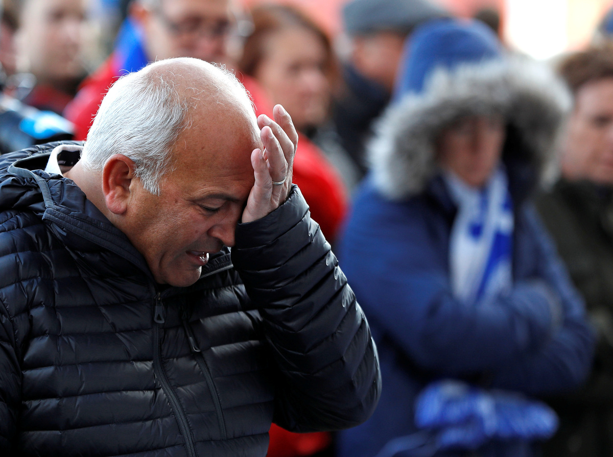 Leicester City football fans pay their respects outside the football stadium, after the helicopter of the club owner Thai businessman Vichai Srivaddhanaprabha crashed when leaving the ground on Saturday evening after the match, in Leicester, Britain, October 28, 2018. REUTERS/Peter Nicholls