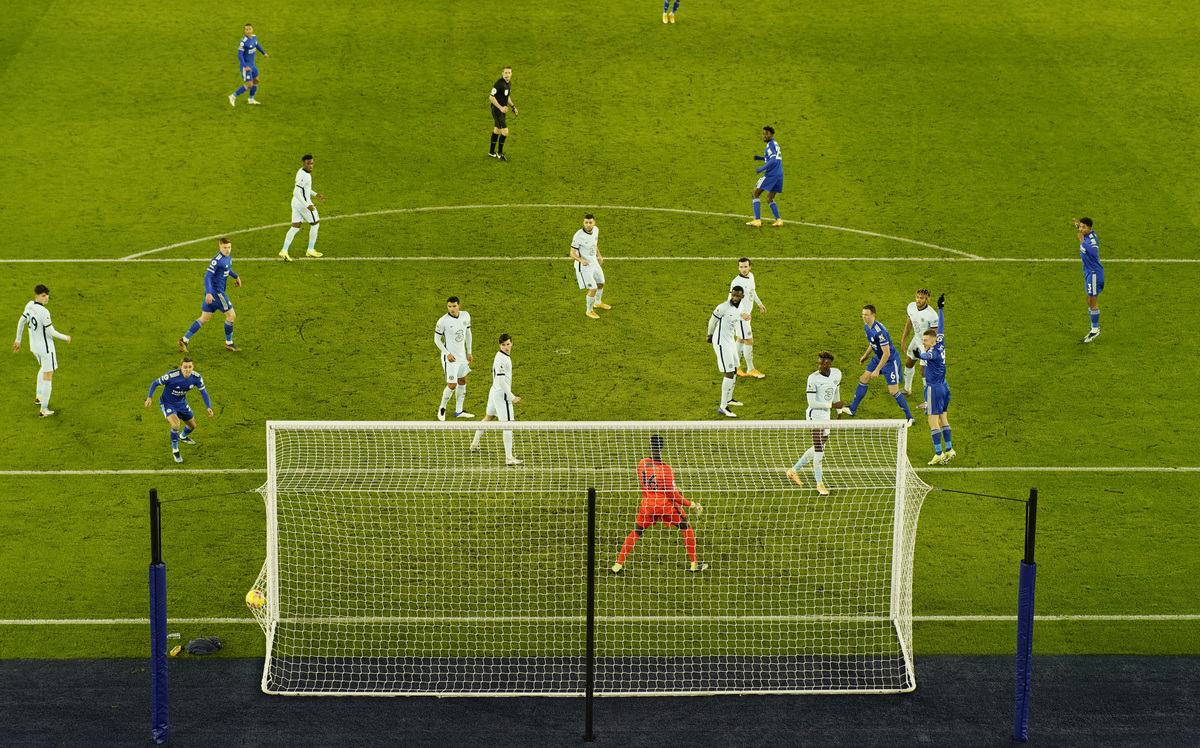 Chelsea were awarded a penalty in the 38th minute when Jonny Evans brought down Christian Pulisic, but after a VAR review, the challenge was ruled to have occurred just outside the area and Mason Mount blasted the free kick over the bar.
