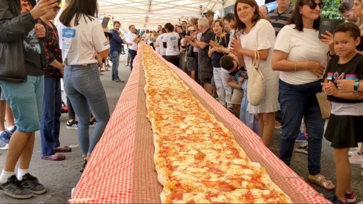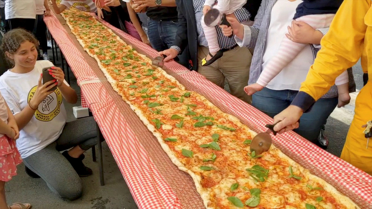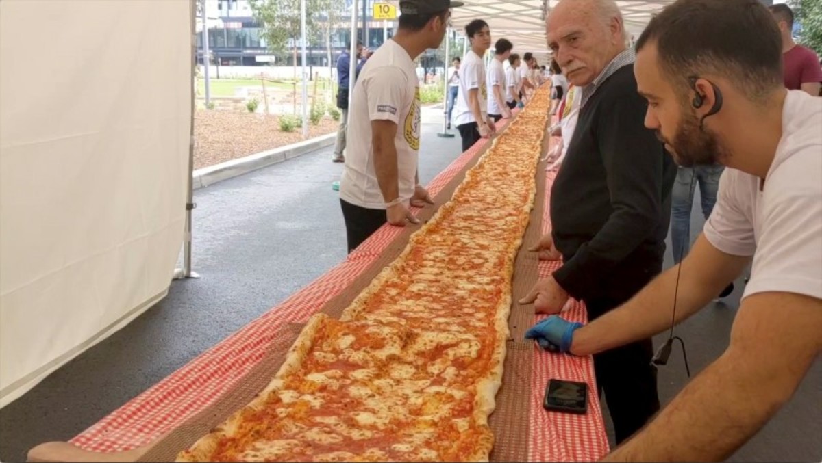 The pizza was rolled out in rectangular, meter-long pieces of dough, pieced together and covered with tomato sauce and mozzarella, before being baked using a conveyor oven.