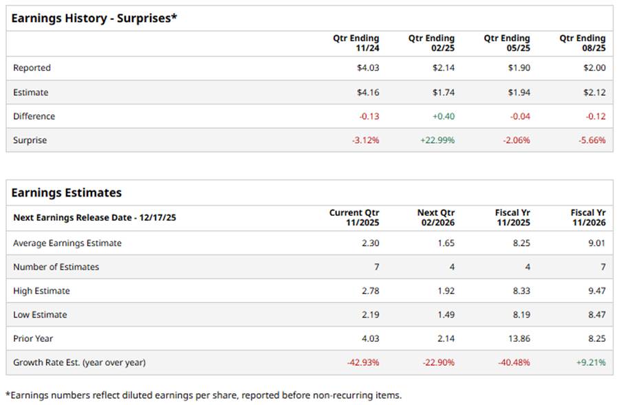 Ahead of this event, analysts project this company to report a profit of $2.30 per share, down 42.9% from $4.03 per share in the year-ago quarter. The company has surpassed Wall Street’s bottom-line estimates in one of the last four quarters, while missing on three other occasions.